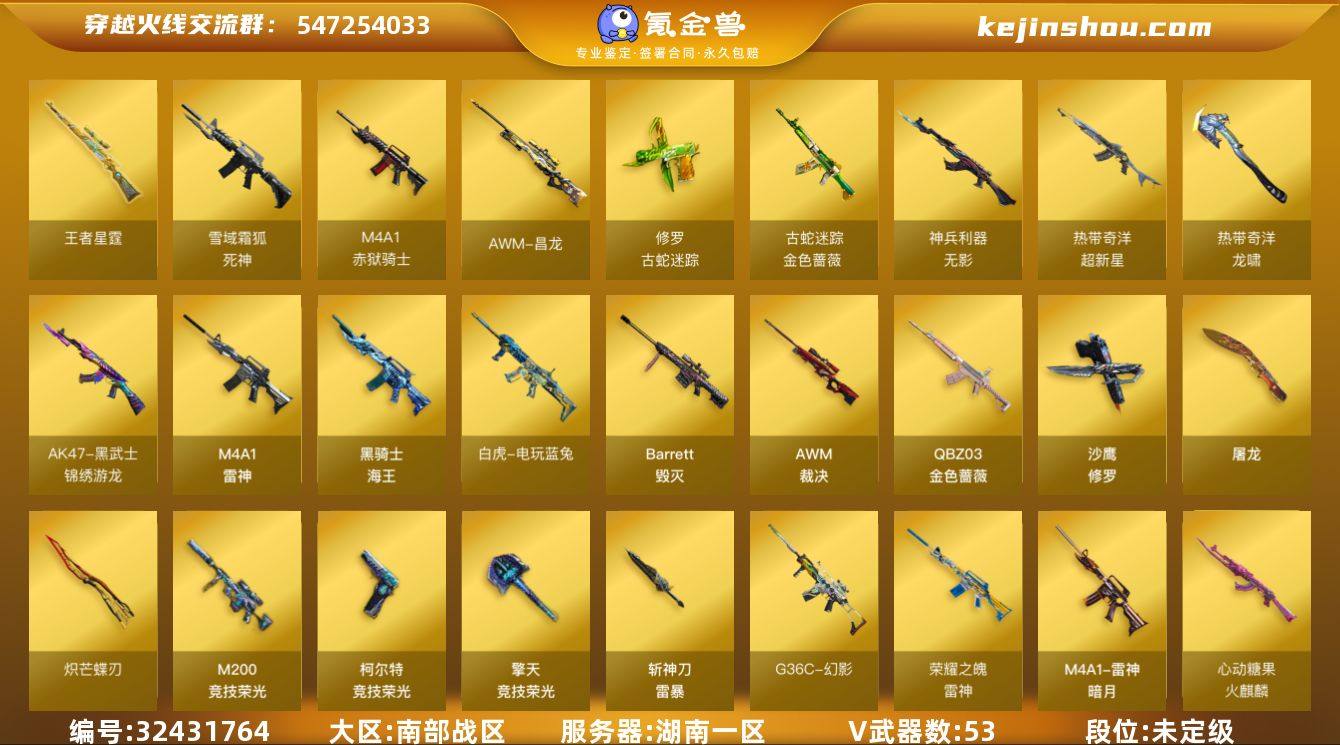 湖南一区-50V-1王者武器数-0炫金武器数 【热门武器】:G36C-幻影,QBZ03-金色蔷薇,金色蔷薇-古蛇迷踪,修罗-古蛇迷踪,M200-竞技荣光,白虎-电玩蓝兔,沙鹰-修罗*2,炽芒蝶刃,炽芒蝶刃-破浪逐光 皮肤 【王者炫金武器】:王者星霆 【音效卡】:QBZ03-金色蔷薇音效卡,Barrett-碧霄极光音效卡*2,炼狱-百战金芒-庆典舞曲音效卡,死神-雪域霜狐-怀旧音效卡,AWM-昌龙-怀旧音效卡 【皮肤】:金色蔷薇-破浪逐光 皮肤,裁决-流光秘银,雷神-暗月,雷神-荣耀之魄,雷神-源计划2.0专属 皮肤,雷神-化蛇 皮肤,M4A1-再燃火线,火麒麟-心动糖果,毁灭-虹光风暴 皮肤,幻影-破浪逐光 皮肤,屠龙-破浪逐光 皮肤,轻型军用手斧-再燃火线,炽芒蝶刃-破浪逐光 皮肤 【角色】:电竞教官-云悠悠,零·纪元,战地猎狐,王者影豹,雪域霜狐,蛇隐宗,奇洋探员,葵-阿尔法武装,初恋灵狐,电竞少女,芳心审判者,飞虎队-X,风暴女,虎妞,嘉年华灵狐,兰-海滩派对,灵狐者-X,龙儿,麻雀,玫瑰花神,潘多拉-X,蛇姬,斯沃特-X,兔囡囡,维纳斯,新娜塔莎,影武者-X,游珑儿,智影,潘多拉-N 【人偶武器】:超新星-枪娘安琪儿,星神-枪娘默,迷你钢铁终结者,街机小灰机,AWM-灵狐-15周年嘉年华*2...