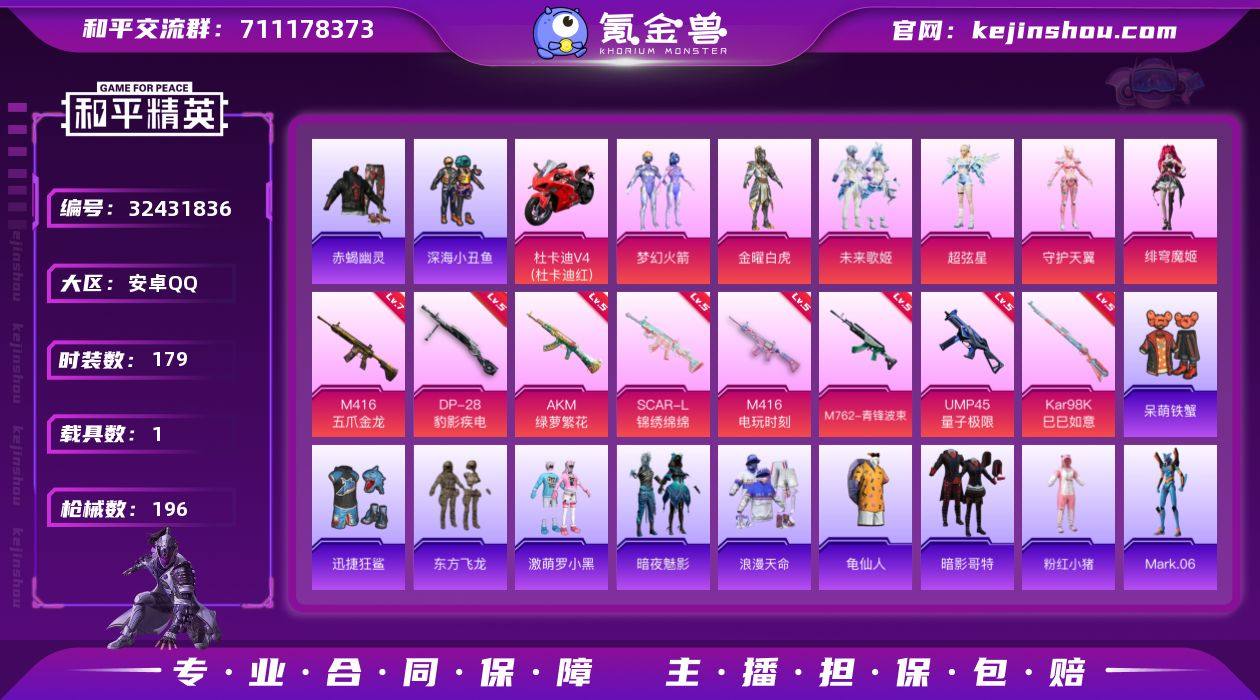 安卓【男神号 粉装-梦幻火箭,套装-浪漫天命,套装-赤蝎幽灵,套装-暗影哥特,角色-Mark.06,M416-五爪金龙(七级),M416-电玩时刻(五级),杜卡迪 Panigale V4(杜卡迪红)】 手Q-6粉装-8特效枪-1载具-4粉色飞行器-68511热力值-15王牌印记-179套装-196枪皮 【稀有套装】:套装-龟仙人,套装-绒宝小鹅,套装-巳巳如意,套装-雏菊兔兔,套装-萝兰蝴蝶,套装-小熊娃娃,角色-米开朗基罗,套装-尼罗河传说,套装-先驱飞行员,套装-糖糖葫芦,套装-青团波波,角色-都市丽猫,套装-燕燕于飞,套装-鱼渊荷华,套装-星渊小夜曲 【稀有头盔】:银河战甲头盔(1级),梦幻火箭头盔(3级),梦幻火箭头盔(2级),梦幻火箭头盔(1级),幻影战神头盔(2级),幻影战神头盔(1级),深海小丑鱼头盔(3级),深海小丑鱼头盔(1级) 【粉色飞行器】:梦幻火箭飞行器,齐天大圣飞行器,闪光银龙飞行器,冠军兔兔飞行器 【粉色载具】:杜卡迪 Panigale V4(杜卡迪红) 【粉色枪皮】:AKM-绿萝繁花,SCAR-L-锦绣绵绵,M416-五爪金龙,M416-电玩时刻,M762-青锋波束,UMP45-量子极限,Kar98K-巳巳如意,DP-28-豹影疾电 【粉色套装】:粉装-金曜白虎,粉装-梦幻火箭,粉装-未来歌姬,角色-超弦星,角色-守护天翼,...