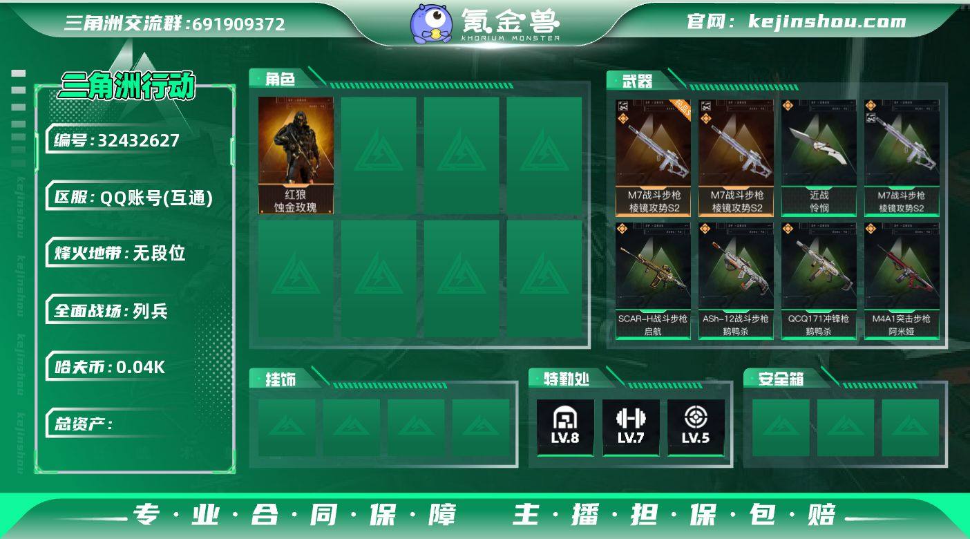 "YXB-满体满负满仓库-部门全满-15768k哈伏币-总资产310m流动资产195m-60烽火等级-铂金-12战场等级-列兵 【特勤处】仓库10训中7靶场7部门44444 【干员外观】:红狼-蚀金玫瑰,骇爪-水墨云图,露娜-黑·天际线,威龙-壮志凌云,蜂医-送葬人·无题密令,无名-夜鹰,深蓝-不破誓约,红狼-电锯惊魂,露娜-金牌射手 【近战皮肤】:近战-北极星,近战-黑鹰 【传说外观】:M4A1突击步枪-蚀金玫瑰,SG552突击步枪-运动员,AK-12突击步枪-夜鹰,SCAR-H战斗步枪-铁艺苍穹,SCAR-H战斗步枪-水墨云图,SCAR-H战斗步枪-启航,CAR-15突击步枪-黑鹰坠落,CAR-15突击步枪-阿米娅,腾龙突击步枪-捞点薯条,K437突击步枪-北极星,KC17突击步枪-电锯惊魂,SMG-45冲锋枪-骑士,勇士冲锋枪-能天使-午夜邮差,QCQ171冲锋枪-北极星,725双管霰弹枪-送葬人-无题密令,M250通用机枪-骑士之心,M700狙击步枪-零度协议,AWM狙击步枪-捞点薯条,93R-捞点薯条,复合弓-黑·天际线 【挂饰】:挂饰-黑夜猎手,挂饰-王国利刃,挂饰-骇客纪元,挂饰-低音艺术家,挂饰-灵魂摇滚,挂饰-爆裂鼓声,挂饰-幸运鼠鼠,挂饰-阿萨拉盾兵,挂饰-阿萨拉机枪兵,挂饰-阿萨拉喷火兵,挂饰-麦小鼠,挂饰-火箭玫瑰,挂饰-羊角威龙,挂饰-窃风密探,挂饰-黄金视野,挂饰-维什戴尔,挂饰-北极星,挂饰-蚀金玫瑰,挂饰-黑,挂饰-崩岩重炮,挂饰-三联装手炮,挂饰-来点薯条,挂饰-晶石幻想,挂饰-彩蛋,挂饰-小羊,挂饰-王牌座驾,挂饰-启程,挂饰-雪人,挂饰-紧急撤离 "