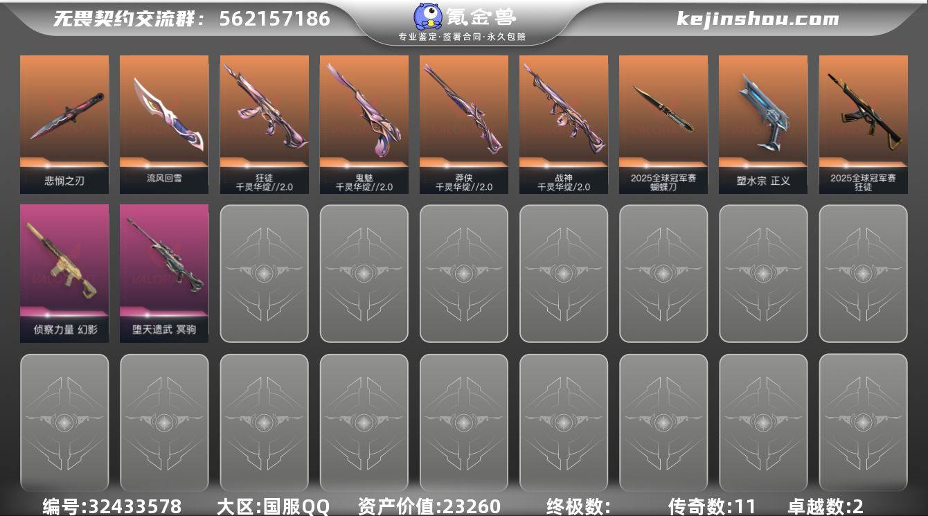【自带包赔 可赔三倍】:库存价值 23260 当前铂金25冠军 千灵2.0套装 超精品T0性价比热门库存号 可更改二次实名 500【限定】: 无畏契约季前邀请赛 悲悯之刃, 2025全球冠军赛 狂徒, 2025全球冠军赛 蝴蝶刀 【近战】: 无畏契约季前邀请赛 悲悯之刃, 流风回雪, 2025全球冠军赛 蝴蝶刀 【狂徒】: 千灵华绽//2.0 狂徒, 2025全球冠军赛 狂徒 【幻影】: 侦察力量 幻影 【冥驹】: 堕天遗武 冥驹 【正义】: 塑水宗 正义 【鬼魅】: 千灵华绽//2.0 鬼魅 【战神】: 千灵华绽//2.0 战神 【莽侠】: 千灵华绽//2.0 莽侠 【概要】: 总皮肤 37 终极0 传奇11 卓越2 刀皮3 英雄18 LV76 历史最高:铂金 当前段位:铂金 已使用 500 R点 剩余 45 R点 可二次 卡面、挂饰、其他皮肤请看截图 道具、段位等以实际验号为准。如账号因没有维护,赛季更新等不可抗因素发生变化,不属于账号质量问题"