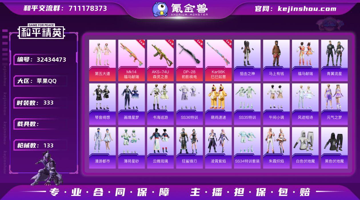 实名: 可修改 时装数: 333 枪械数: 133 热门装扮: 第五大道 稀有枪皮: Kar98K-巳巳如意,DP-28-豹影疾电,AKS-74U-森灵之息,MK14-福马献瑞
