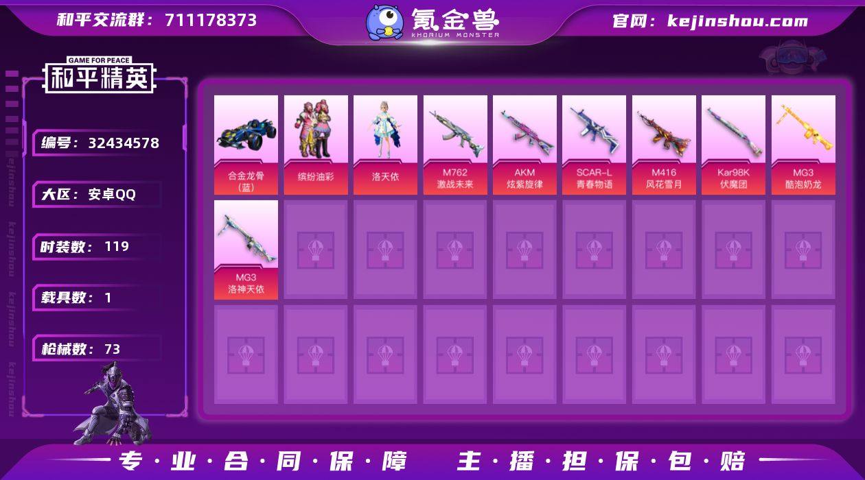 【稀有枪皮】Kar98K-圣域龙灵,破片手榴弹-瓶中星球,AUG-圣斗士星矢,AMR-智耀战神,AKS-74U-星穹咏叹调,ACE32-萌骑漫游,AA12-G-萌骑幻想,MK14-福马献瑞,M416风花雪月,M762激战未来,Kar98K伏魔团,AKM炫紫旋律,MG3洛神天依,SCAR-L青春物语,MG3酷泡奶龙