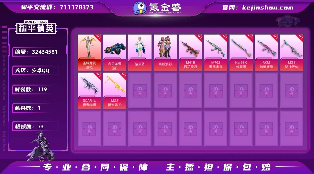【稀有枪皮】Kar98K-圣域龙灵,破片手榴弹-瓶中星球,AUG-圣斗士星矢,AMR-智耀战神,AKS-74U-星穹咏叹调,ACE32-萌骑漫游,AA12-G-萌骑幻想,14-福马献瑞,M416风花雪月,M762激战未来,Kar98K伏魔团,AKM炫紫旋律,MG3洛神天依,SCAR-L青春物语,MG3酷泡奶龙