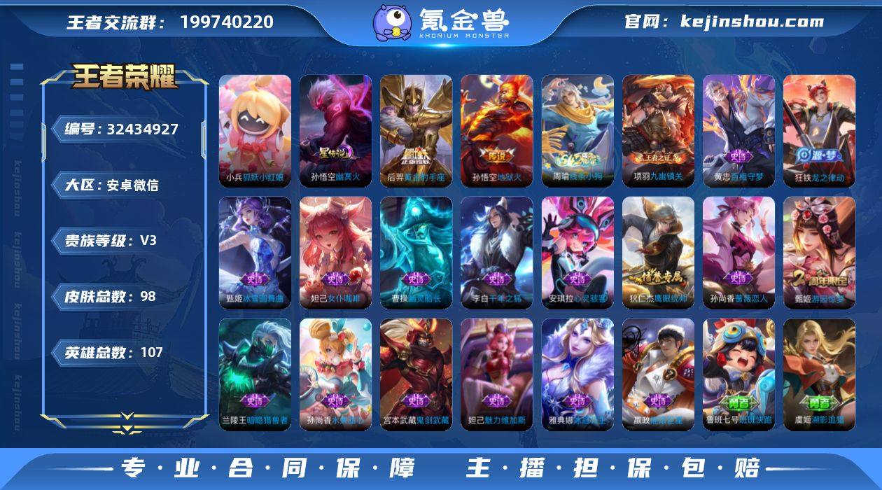 贵族V3,安卓微信412区,英雄有107个,英雄皮肤有98个,星元皮肤有30个,荣耀水晶有1个,微信账号有实名的,传说皮肤有两个,微信注册两年了,一手号,自己注册的,大家放心买