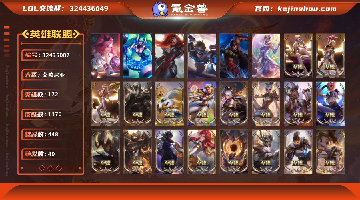 未定级段位-172英雄-1133皮肤-634炫彩-5终极-99神话-199限定-102传说-214史诗 【神话皮肤】:十周年纪念安妮,源代码乐芙兰,十五周年纪念希维尔,水晶圣骑艾希,新卧虎藏龙贾克斯,暗星科加斯,神凰行者瑞羽圣凰艾尼维亚,黎明使者卡尔玛,灰烬征服者潘森,灰烬骑士莫德凯撒,水晶圣骑蕾欧娜,灰烬守护者慎,水晶掠夺者卡兹克,星之守护者塔莉垭,灰烬杀手塞拉斯,海克斯科技安妮,海克斯科技波比,海克斯科技崔丝塔娜,海克斯科技嘉文四世,海克斯科技吉格斯,海克斯科技卡萨丁,海克斯科技克格莫,海克斯科技雷克顿,海克斯科技瑟庄妮,海克斯科技斯维因,恐惧新星德莱厄斯,摄魂使者薇恩,新创战纪希维尔,至臻真实伤害奇亚娜,至臻真实伤害奇亚娜2022,至臻真实伤害赛娜,至臻真实伤害亚索,至臻至高天奎桑提,至臻天龙之子伊泽瑞尔,至臻西部魔影伊芙琳,至臻电玩女神凯特琳,至臻电玩女神凯特琳2022,至臻DRX亚托克斯,至臻飞升战神潘森,至臻福牛守护者菲奥娜,至臻海珀利安小队X09星环灵风迦娜,至臻海之歌萨勒芬妮,至臻黑夜使者凯隐,至臻黑夜使者李青,至臻黑夜使者李青2022,至臻幻灵战斗猫金克丝,至臻花仙使者卡特琳娜,至臻魂蔷薇烈娜塔,至臻剪纸仙灵希维尔...