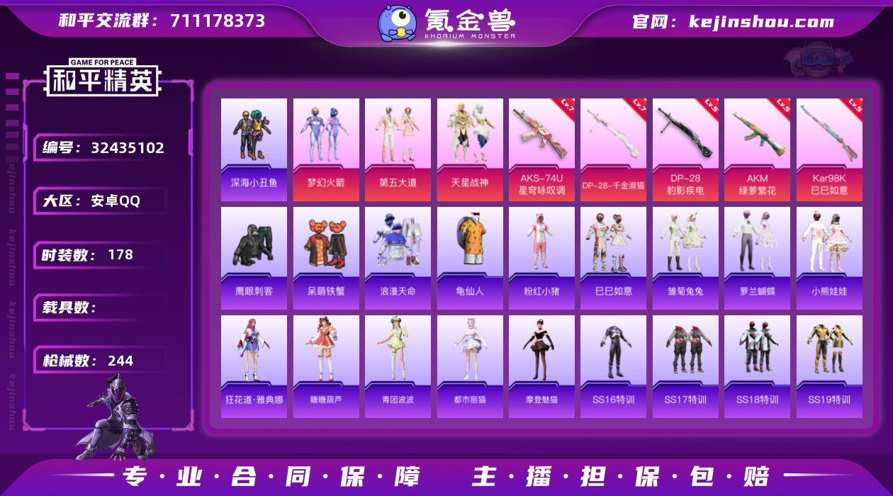 【kyhp1082】安卓 手Q-4粉装-7特效枪-0载具-1粉色飞行器-67840热力值-16王牌印记-178套装-244枪皮 【热门品类】:粉装-梦幻火箭,套装-浪漫天命,套装-深海小丑鱼,套装-龟仙人,套装-粉红小猪 【粉色套装】:粉装-梦幻火箭,粉装-第五大道,粉装-天星战神,角色-罪夜之冕 【粉色枪皮等级】:AKM-绿萝繁花(五级),UMP45-萌骑冒险(五级),AKS-74U-星穹咏叹调(七级),Kar98K-巳巳如意(五级),Mk14-福马献瑞(五级),DP-28-千金淑猫(七级),DP-28-豹影疾电(五级) 【粉色枪皮】:AKM-绿萝繁花,UMP45-萌骑冒险,AKS-74U-星穹咏叹调,Kar98K-巳巳如意,Mk14-福马献瑞,DP-28-千金淑猫,DP-28-豹影疾电 【粉色飞行器】:炫彩糖果飞行器 【粉色降落伞】:梦幻火箭降落伞,怪笑疯兔降落伞,暗夜玫瑰降落伞,旋转彩虹降落伞,海螺星光降落伞,飒粉甜心降落伞,未来歌姬降落伞,莲影清波降落伞,金丰海韵降落伞,千金淑猫降落伞,樱桃泡泡降落伞,异瞳寒姬降落伞,炫彩糖果降落伞 【稀有套装】:套装-龟仙人,套装-巳巳如意,套装-炫彩糖果,角色-奈斯,角色-魂电,角色-罗莉,角色-幸运青,角色-X,角色-阿虎,套装-马上有钱,套装-雏菊兔兔,套装-萝兰蝴蝶,套装-小熊娃娃,角色-狂花道...