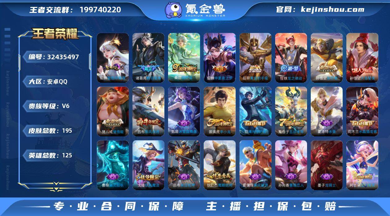 安卓Q-V6-最强王者段位-125英雄-195皮肤-4传说-32史诗 【传说皮肤】:桑启鸣野蒿,诸葛亮鹤羽星尊,后羿黄金射手座,貂蝉仲夏夜之梦 【限定皮肤】:姜子牙天穹之誓,狄仁杰阴阳师,赵云皇家上将,孙尚香蔷薇恋人,庄周高山流水,高渐离死亡摇滚,吕布御风骁将,夏侯惇朔风刀,狄仁杰魔术师,狄仁杰万华元夜,达摩星际陆战队,达摩沙漠行僧,项羽海滩派对,老夫子醍醐杖,程咬金演武夺筹,兰陵王金庭之子,孙悟空大圣娶亲,孙悟空孙行者,李元芳云中旅人,钟馗驱傩正仪,鬼谷子原初探秘者,鬼谷子五谷丰年,诸葛亮鹤羽星尊,苏烈千军破阵,弈星混沌棋,沈梦溪大漠名商,明世隐疑决卦,裴擒虎李小龙,裴擒虎擒涛扼浪,米莱狄胡桃异想国,猪八戒猪悟能,西施玲珑珍味,鲁班大师探海日志,桑启海盐诗旅,戈娅驭风魔法,艾琳女武神,阿古朵江河有灵,张良古海寻踪,鬼谷子天穹祈灯,沈梦溪龙舞盛年,刘邦剑破天穹,程咬金群星魔术团,周瑜熔金海岸 【年限皮肤】:吕布御风骁将 【赛季限定】:夏侯惇朔风刀,弈星混沌棋,明世隐疑决卦,老夫子醍醐杖,鬼谷子原初探秘者,狄仁杰万华元夜,程咬金演武夺筹,钟馗驱傩正仪,苏烈千军破阵,达摩沙漠行僧,兰陵王金庭之子,沈梦溪大漠名商...