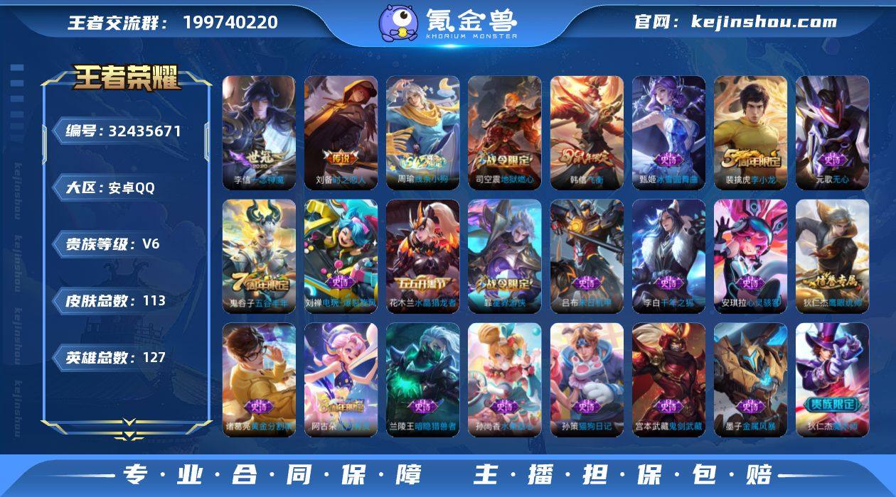安卓Q-V6-尊贵铂金II段位-127英雄-113皮肤-2传说-24史诗 【传说皮肤】:李信一念神魔,刘备时之恋人 【限定皮肤】:狄仁杰阴阳师,赵云皇家上将,高渐离玩趣恶龙,元歌无心,狄仁杰魔术师,狄仁杰万华元夜,达摩沙漠行僧,项羽海滩派对,韩信飞衡,兰陵王金庭之子,李元芳匿光侦查者,李元芳云中旅人,钟馗驱傩正仪,鬼谷子五谷丰年,苏烈千军破阵,沈梦溪大漠名商,明世隐疑决卦,裴擒虎李小龙,裴擒虎擒涛扼浪,嫦娥暖冬兔眠,鲁班大师探海日志,桑启海盐诗旅,暃星界游侠,艾琳流音漫舞,司空震地狱燃心,阿古朵江河有灵,张良古海寻踪,鬼谷子天穹祈灯,刘邦剑破天穹,程咬金群星魔术团 【年限皮肤】:韩信飞衡 【赛季限定】:明世隐疑决卦,狄仁杰万华元夜,钟馗驱傩正仪,苏烈千军破阵,达摩沙漠行僧,兰陵王金庭之子,沈梦溪大漠名商,李元芳云中旅人,桑启海盐诗旅,裴擒虎擒涛扼浪,鲁班大师探海日志,张良古海寻踪,鬼谷子天穹祈灯,刘邦剑破天穹 【战令限定】:暃星界游侠,嫦娥暖冬兔眠,司空震地狱燃心,艾琳流音漫舞,周瑜线条小狗 【史诗皮肤】:周瑜线条小狗,阿古朵江河有灵,司空震地狱燃心,李元芳匿光侦查者,刘禅电玩爆裂旋风,暃星界游侠,元歌无心,鬼...
