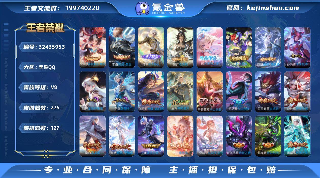 V9 2典藏 32传说 336皮肤 127英雄 【2水晶】关羽-赤影疾锋,铠-银白咏叹调【32传说】司空震-愿照·山河定,澜-愿照·九州拓,澜-电玩·雷克斯,吕布-遇见神鼓,澜-逐花归海,桑启-鸣野蒿,宫本武藏-惊梅引,曜-云鹰飞将,马可波罗-妄想实况,东皇太一-灼幽烈阳,干将莫邪-画中仙,孙悟空-齐天大圣,李白-诗剑行,马可波罗-深海之息,马超-无双飞将,达摩-黄金狮子座,狄仁杰-超时空战士,干将莫邪-久胜战神,宫本武藏-地狱之眼,后羿-黄金射手座,镜-炽阳神光,铠-绛天战甲,李信-一念神魔,孙悟空-地狱火,王昭君-乞巧织情,虞姬-启明星使,赵云-淬星耀世,周瑜-音你心动,诸葛亮-时雨天司,吕布-怒海麟威,云缨-幻光神枪,亚连-落雪白狼【99史诗】关羽-冰锋战神,韩信-飞衡,马超-神威,狂铁-龙之律动,牛魔-星界战将,黄忠-怒海争锋,关羽-决胜骁骑,芈月-浮光幕影,海诺-心动手记,阿古朵-江河有灵,司空震-地狱燃心,鬼谷子-天穹祈灯,后羿-石田雨龙,甄姬-逆浪荇歌,亚连-破空之剑,黄忠-百相守梦,赵怀真-器灵·浮梦炉,扁鹊-奇幻香踪,沈梦溪-匿光破解者,暃-星界游侠,梦奇-顽趣,戈娅-驭风魔法,刘禅-电玩·爆裂旋风,马可波罗-山海·玄木吟,镜-青焰无极,后羿-完美运算,蒙犽-百解令,曹操-幽灵船长,曹操-天狼征服者,嫦娥-拒霜思,程咬金-功夫厨神,妲己-女仆咖啡,妲己-魅力维加斯,狄仁杰-魔术师,狄仁杰-鹰眼统帅,貂蝉-圣诞恋歌,东皇太一-逐梦之光,伽罗-箭羽风息,干将莫邪-冰霜恋舞曲,宫本武藏-鬼剑武藏,韩信-傲雪梅枪,花木兰-水晶猎龙者,橘右京-修罗,铠-曙光守护者,兰陵王-暗隐猎兽者,老夫子-航海奇遇记,李元芳-逐浪之夏,廉颇-地狱岩魂,刘邦-德古拉伯爵,刘禅-绅士熊喵,刘禅-天才门将,露娜-紫霞仙子,吕布-圣诞狂欢,吕布-末日机甲,吕布-御风骁将,马可波罗-逐梦之星,蒙犽-狂想玩偶喵,蒙恬-荣光圣徽,米莱狄-胡桃异想国,墨子-金属风暴,阿轲-化蝶舞,狄仁杰-绮世丹青,上官婉儿-梁...