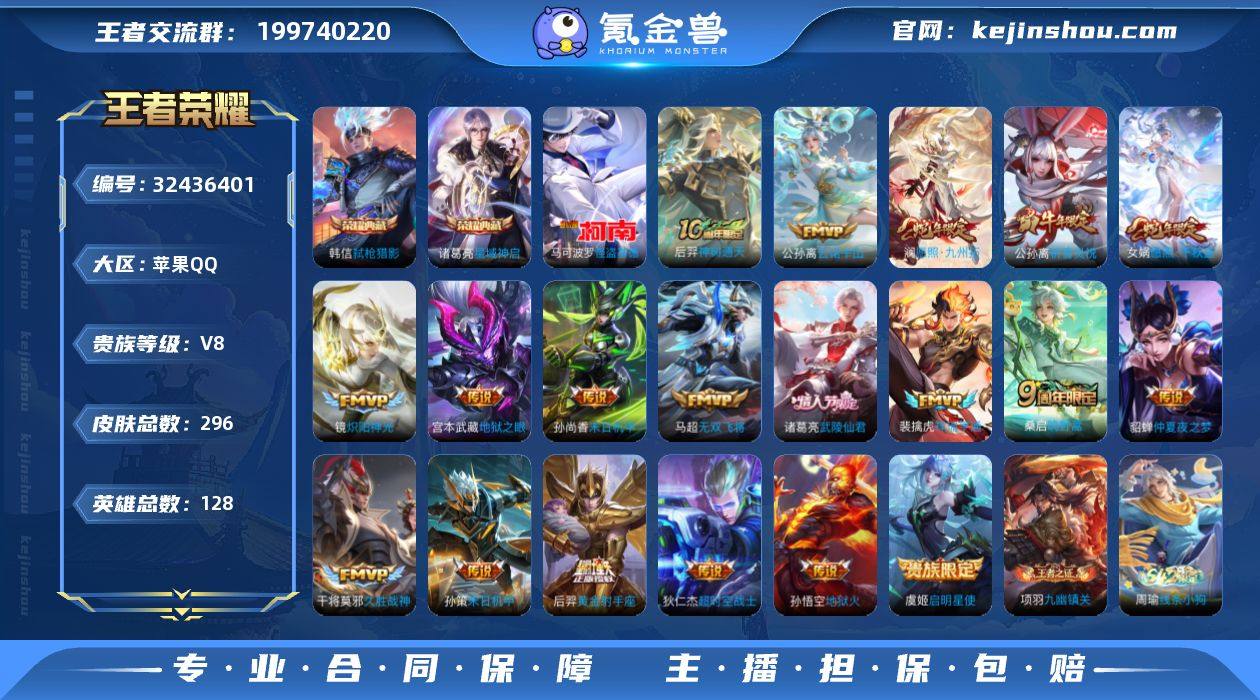 苹果Q-V8-最强王者段位-128英雄-296皮肤-2典藏皮肤-1珍品传说-26传说-85史诗【英雄全皮】:孙权全皮,敖隐全皮,空空儿全皮【荣耀典藏】:诸葛亮星域神启,韩信弑枪猎影【珍品传说】:马可波罗怪盗基德【传说皮肤】:韩信踏浪归,云缨神骥越千峰,关羽神骥镇沧海,朵莉亚神骥鸣幻洲,狄仁杰神骥赴朔漠,貂蝉神骥聚万邦,马超神骥逐星野,后羿神树通天,公孙离云诺千山,女娲愿照千秋盛,澜愿照九州拓,裴擒虎祥瑞亨通,桑启鸣野蒿,马超无双飞将,孙策末日机甲,公孙离祈雪灵祝,镜炽阳神光,虞姬启明星使,干将莫邪久胜战神,后羿黄金射手座,诸葛亮武陵仙君,貂蝉仲夏夜之梦,孙尚香末日机甲,宫本武藏地狱之眼,孙悟空地狱火,狄仁杰超时空战士【限定皮肤】:暃埋骨钱,蒙犽顽岩魄,蔡文姬夏日便利店,大乔绒语心约,虞姬夏日便利店,姜子牙天穹之誓,杨戬破阵退雄兵,狄仁杰阴阳师,廉颇寅虎御盾,赵云皇家上将,赵云引擎之心,鲁班七号狮舞东方,庄周云端筑梦师,芈月重明,芈月白晶晶,吕布御风骁将,周瑜赤莲之焰,元歌云间偶戏,夏侯惇朔风刀,曹操天狼征服者,典韦穷奇,典韦岱宗,马可波罗暗影游猎,狄仁杰魔术师,狄仁杰万华元夜,达摩星际陆战队,项羽海滩派对,...