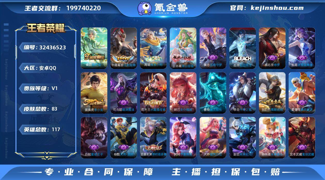 安卓Q-V1-至尊星耀II段位-117英雄-83皮肤-2传说-25史诗 【传说皮肤】:桑启鸣野蒿,干将莫邪久胜战神 【限定皮肤】:姜子牙天穹之誓,狄仁杰阴阳师,高渐离玩趣恶龙,李元芳云中旅人,百里玄策原初追逐者,裴擒虎李小龙,裴擒虎擒涛扼浪,鲁班大师探海日志,桑启海盐诗旅,张良古海寻踪,鬼谷子天穹祈灯,刘邦剑破天穹 【赛季限定】:李元芳云中旅人,桑启海盐诗旅,裴擒虎擒涛扼浪,鲁班大师探海日志,张良古海寻踪,鬼谷子天穹祈灯,刘邦剑破天穹,姜子牙天穹之誓,钟馗虚灵犬护,甄姬逆浪荇歌,亚瑟荣光之誓,百里玄策原初追逐者 【战令限定】:周瑜线条小狗 【史诗皮肤】:周瑜线条小狗,公孙离涂山容容,黄忠百相守梦,后羿石田雨龙,司马懿暗渊魔法,杨戬天秀启明,裴擒虎李小龙,百里玄策原初追逐者,橘右京修罗,狄仁杰鹰眼统帅,大乔猫狗日记,阿轲节奏热浪,白起星夜王子,李元芳逐浪之夏,小乔缤纷独角兽,夏侯惇乘风破浪,花木兰水晶猎龙者,张飞乱世虎臣,李白千年之狐,曹操幽灵船长,妲己女仆咖啡,孙尚香水果甜心,宫本武藏鬼剑武藏,廉颇地狱岩魂,甄姬冰雪圆舞曲,赵云未来纪元 【其他皮肤】:兰陵王雾影缉谜,艾琳鹤鸣心笺,亚瑟荣光之誓,甄姬逆浪荇歌,...