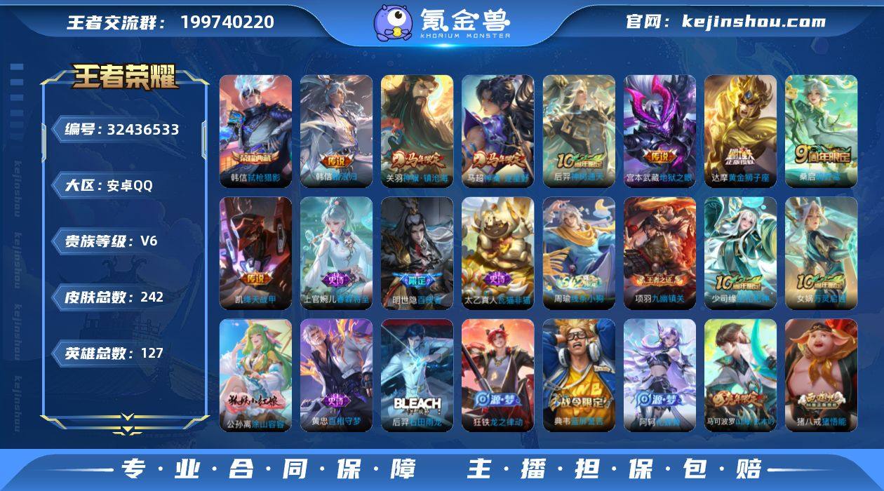 【商品标题】:安卓Q-V6-最强王者段位-124英雄-295皮肤-1典藏-0珍品无双-0无双-0珍品传说-13传说-95史诗 【荣耀典藏】:瑶拾光映像 【内测皮肤】:孙尚香蔷薇恋人,嬴政优雅恋人,艾琳女武神,高渐离玩趣恶龙,狂铁特工战影 【传说皮肤】:干将莫邪久胜战神,曜云鹰飞将,孙悟空零号赤焰,镜炽阳神光,孙策挚爱之约,马超无双飞将,李白诗剑行,曜山海苍雷引,公孙离记忆之芯,露娜霜月吟,赵云乘龙铭钟鼎,桑启鸣野蒿,虞姬愿照岁时盈 【限定皮肤】:蒙犽顽岩魄,蔡文姬夏日便利店,大乔绒语心约,虞姬夏日便利店,姜子牙天穹之誓,杨戬破阵退雄兵,狄仁杰阴阳师,赵云皇家上将,嬴政优雅恋人,孙尚香蔷薇恋人,庄周高山流水,高渐离玩趣恶龙,钟无艳超时空战士,扁鹊奇幻香踪,白起夜都怪侠,芈月幻夜卜梦,吕布御风骁将,元歌云间偶戏,元歌无心,甄姬落雪兰心,马可波罗山海玄木吟,狄仁杰魔术师,狄仁杰万华元夜,达摩沙漠行僧,项羽海滩派对,老夫子醍醐杖,程咬金演武夺筹,韩信傲雪梅枪,王昭君午后时光,兰陵王金庭之子,亚瑟潮玩骑士王,孙悟空零号赤焰,后羿圣弓游侠,李元芳云中旅人,钟馗驱傩正仪,杨戬潮玩骑兵,干将莫邪真爱魔法,雅典娜黎明之约,鬼谷子原初探秘者,鬼谷子五谷丰年,黄忠火炮绅士,苏烈千军破阵,百里玄策原初追逐者,弈星混沌棋,沈梦溪大漠名商,裴擒虎李小龙,裴擒虎擒涛扼浪,狂铁电玩高手,云中君纤云弄巧,孙策挚爱之约,猪八戒猪悟能,上官婉儿梁祝,嫦娥拒霜思,嫦娥暖冬兔眠,曜山海苍雷引,鲁班大师探海日志,镜匿光追影者,桑启海盐诗旅,暃星界游侠,戈娅驭风魔法,艾琳女武神,艾琳流音漫舞,司空震地狱燃心,阿古朵江河有灵,张良古海寻踪,蒙犽百解令,蒙恬荣光圣徽,高渐离燃音魔法,妲己灵卜魔法,鬼谷子天穹祈灯,姬小满妄想食味,赵云乘龙铭钟鼎,沈梦溪龙舞...