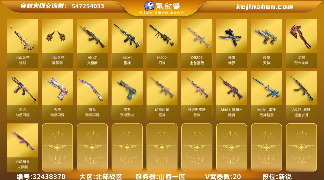 山西一区-25V-2王者武器数-0炫金武器数 【热门武器】:QBZ03-金色蔷薇,M200-幻神,沙鹰-修罗 【音效卡】:炼狱-百战金芒-庆典舞曲音效卡 【皮肤】:M4A1-战神赵云,雷神-维纳斯皮肤,雷神-动感闪耀 皮肤,M4A1-再燃火线,火麒麟-心动糖果,AK47-火麒麟-百城23冠军皮肤,黑骑士-暗月,战神-流金岁月皮肤,轻型军用手斧-再燃火线 【角色】:乔伊教练,修道士,云海玲珑,葵-阿尔法武装,幻面灵狐,暗夜-X,嘉年华灵狐,荆棘玫瑰,灵狐-花神,灵狐者-X,潘多拉-X,斯沃特-X,铁骑荣耀,五号兵器-赛博朋克,潘多拉-N 【暴走生化】:超级对讲机 【挑战大师】:冰龙粉碎者-白马银枪 【英雄级武器】:AK47-火麒麟,M4A1-雷神,QBZ03-金色蔷薇,烈火-动感闪耀,HK417-朱雀-电竞之星,M200-幻神,炼狱-百战金芒,沙鹰-修罗,沙鹰-天神*2,天神-动感闪耀,修罗-云海游龙,屠龙-动感闪耀,麒麟刺-百战金芒,屠龙-电竞之星,龙啸-烈火龙威,高爆手雷-云龙*2,闪光弹-雷霆王者-觉醒版*2 【源级武器】:QBZ03-文殊坊,魂·炼狱-玩具枪,魂·龙啸-玩具枪,魂·麒麟刺-神秘黑洞,灵·麒麟刺-穹宇 【道具】:BS战队炫彩背包,云山科技背包,百战金芒炫彩背包,虎牙炫彩背包,超级背包,女皇终结者-...