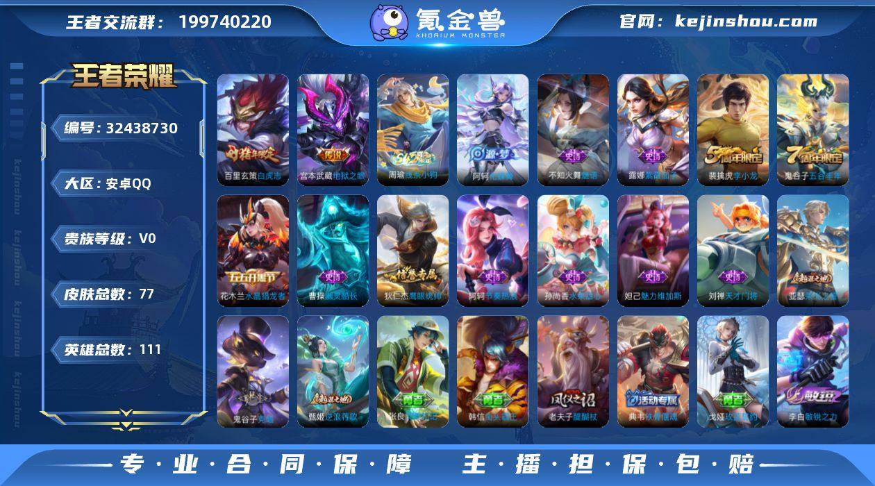 安卓Q-V4-最强王者段位-126英雄-163皮肤-12传说-43史诗 【英雄全皮】:影全皮 【传说皮肤】:后羿神树通天,司空震愿照山河定,澜愿照九州拓,裴擒虎祥瑞亨通,桑启鸣野蒿,马超无双飞将,王昭君乞巧织情,镜炽阳神光,李信一念神魔,干将莫邪久胜战神,后羿黄金射手座,宫本武藏地狱之眼 【限定皮肤】:姜子牙天穹之誓,狄仁杰阴阳师,赵云皇家上将,孙尚香蔷薇恋人,马可波罗山海玄木吟,狄仁杰魔术师,项羽海滩派对,韩信傲雪梅枪,女娲朔望之晖,百里玄策原初追逐者,裴擒虎擒涛扼浪,西施玲珑珍味,鲁班大师探海日志,戈娅驭风魔法,阿古朵江河有灵,张良古海寻踪,鬼谷子天穹祈灯,百里玄策超元猎域,沈梦溪龙舞盛年,鲁班七号蔬乡物语,李元芳蔬乡物语,刘邦剑破天穹,程咬金群星魔术团,镜青焰无极,项羽苍威无极,刘备异域游侠 【年限皮肤】:马可波罗山海玄木吟,司空震愿照山河定,澜愿照九州拓 【赛季限定】:裴擒虎擒涛扼浪,鲁班大师探海日志,张良古海寻踪,鬼谷子天穹祈灯,刘邦剑破天穹,姜子牙天穹之誓,东皇太一噬灭天穹,太乙真人谧流熔炉,钟馗虚灵犬护,甄姬逆浪荇歌,亚瑟荣光之誓,百里玄策原初追逐者,牛魔星界战将,项羽九幽镇关 【战令限定】:女...