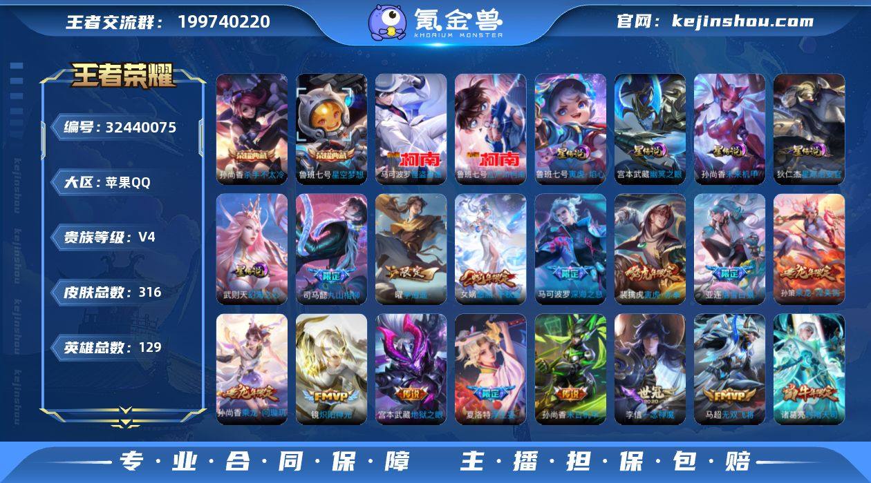 苹果Q-V4-最强王者段位-129英雄-316皮肤-2典藏皮肤-1典藏英雄-2珍品传说-37传说-100史诗【英雄全皮】:司马懿全皮,孙权全皮,娜可露露全皮,敖隐全皮,夏洛特全皮,金蝉全皮,影全皮【荣耀典藏】:武则天英雄,孙尚香杀手不太冷,鲁班七号星空梦想【珍品传说】:鲁班七号江户川柯南,马可波罗怪盗基德【传说皮肤】:司马懿九山相柳,女娲愿照千秋盛,桑启鸣野蒿,亚连落雪白狼,吕布曦玄引,孙尚香乘龙问璇玑,孙策乘龙淬吴钩,鲁班七号时之奇旅,吕布遇见神鼓,夏洛特浮生妄,干将莫邪画中仙,吕布怒海麟威,不知火舞绯月行,王昭君星穹之声,娜可露露前尘镜,孙尚香音你闪耀,马可波罗深海之息,马超无双飞将,女娲补天,裴擒虎寅虎赤拳,鲁班七号寅虎瑞焰,孙尚香异界灵契,曜李逍遥 ,周瑜音你心动,李元芳飞鸢探春,诸葛亮时雨天司,镜炽阳神光,虞姬启明星使,曜云鹰飞将,李信一念神魔,张良黄金白羊座,花木兰冠军飞将,后羿黄金射手座,孙尚香末日机甲,宫本武藏地狱之眼,武则天海洋之心,狄仁杰超时空战士【限定皮肤】:姜子牙天穹之誓,狄仁杰阴阳师,廉颇寅虎御盾,赵云皇家上将,嬴政优雅恋人,孙尚香异界灵契,鲁班七号寅虎瑞焰,鲁班七号时之奇旅,庄周高山...