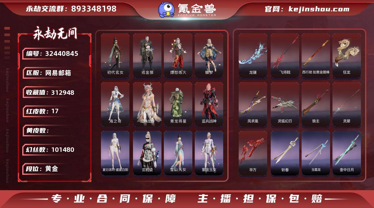 盛夏白阳 龙骧【红皮】:初代玄女(宁红叶皮肤),戎金狼(特木尔皮肤),熛怒炼火(季沧海皮肤),蝶梦(胡桃皮肤),海之奇(崔三娘皮肤),青龙将星(岳山皮肤),灵狐幻刃(太刀皮肤),狼主(阔刀皮肤),灵犀(长枪皮肤),毕方(弓箭皮肤),凤求凰(双刀皮肤),狂龙(双节棍皮肤),泣珠龙纱(崔三娘皮肤),西行劫·如意金箍棒(棍皮肤),飞将戟(斩马刀皮肤),监兵凶神(胡为皮肤),龙骧(双刀皮肤) 【外观总数】:17红 461 金 幻丝:101480金砖: 收藏值:31W 【段位】:单排: 双排: 三排: 【换绑】:3.30可换绑,期间登录网易大神不影响正常游戏,其他皮肤可参考以下截图,道具、段位以实际验号为准,段位因赛季原因发生变化,以上号为准"