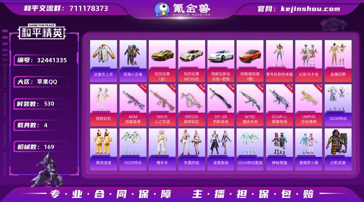 精氪素材号/65级收藏家【巡查员/螳螂/金属狂野/马卡龙】5级m4心之恋语/4级青春物语/满级ak旋紫旋律/深海小丑鱼/浪漫天命/暗影哥特/罗小黑/小熊背包/地铁满天赋/三币车金玛莎/马丁/特斯拉/玛莎mc 实名: 可修改 时装数: 530 载具数: 4 枪械数: 169 战备数: 128 热门装扮: 深海小丑鱼,金属狂野,幻彩马卡龙,巡查员衣服,零号机款机体服,旋转彩虹,激萌罗小黑,神秘黑猫 载具: 玛莎拉蒂Ghibli(金),特斯拉Model 3(珍珠白),阿斯顿·马丁DBX(橙),玛莎拉蒂MC20(星石白) 稀有枪皮: AKM炫紫旋律,M416心之恋语,M762激战未来,SCAR-L青春物语,UMP45恐龙拽拽,GROZA旋转彩虹,DP-28-豹影疾电