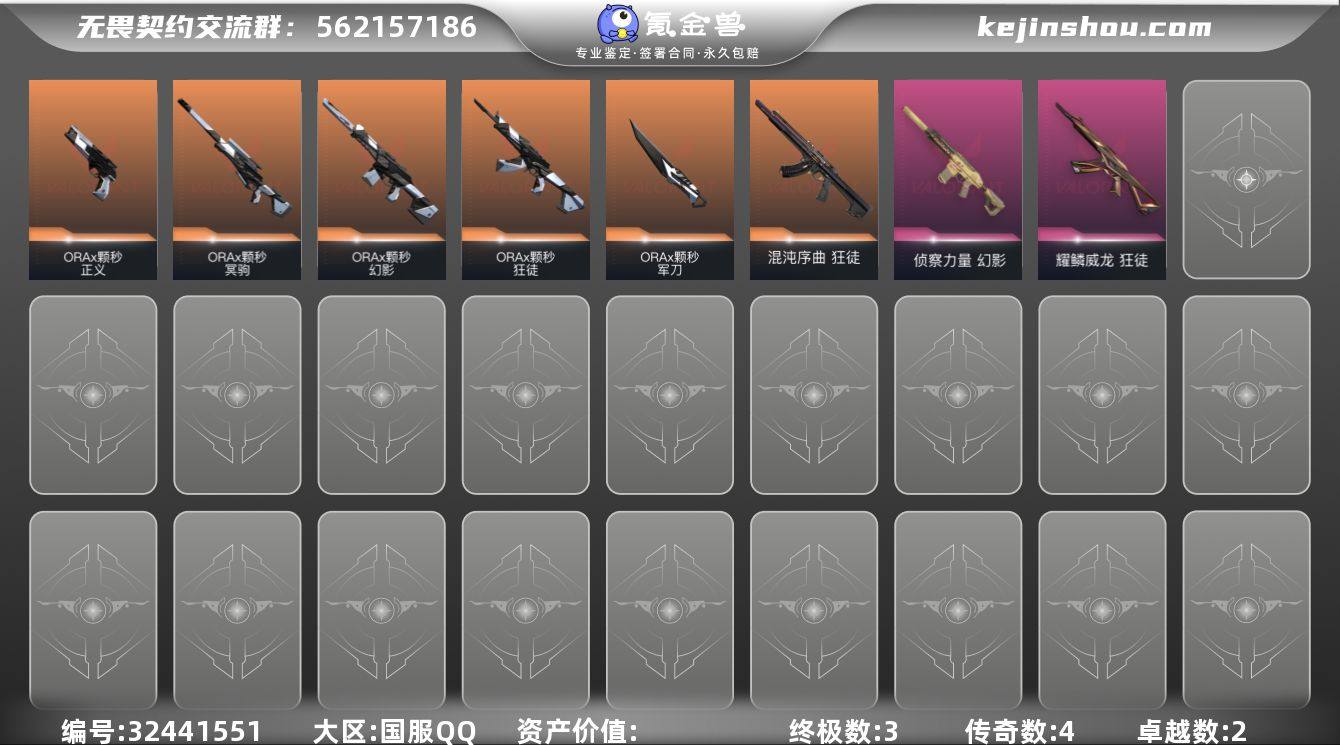 【935307】【套装】:ORA x 颗秒套装 【英雄】:幻棱,炼狱,维斯,暮蝶,钛狐,壹决,铁臂,捷风,雷兹,幽影,不死鸟,贤者,猎枭,蝰蛇,零,芮娜,奇乐,尚勃勒,霓虹,斯凯,夜露,星礈,K/O,海神,盖可,黑梦,钢锁 【近战武器】:近战武器-碎心裂刃,近战武器-ORA x 颗秒 军刀 【狂徒】:狂徒-混沌序曲,狂徒-ORA x 颗秒,狂徒-耀鳞威龙 【幻影】:幻影-ORA x 颗秒,幻影-侦察力量 【冥驹】:冥驹-ORA x 颗秒 【骇灵】:骇灵-无限竞技 【正义】:正义-ORA x 颗秒 【卡面】:红鳞松叶 卡面,Clutch 卡面,无畏契约GO!第一卷:芮娜 卡面,无畏契约GO!第一卷:零 卡面,代号红色 卡面,新兵报到 卡面,V契约 卡面,无畏契约 卡面 【喷漆】:像素星礈 喷漆,黯兽卖萌 喷漆,惊声尖叫 喷漆,审判之爪 喷漆,加油!加油! 喷漆,买装还是存钱 喷漆,关门放狗 喷漆,放手一搏 喷漆,胜利属于无畏契约 喷漆,GLHF 喷漆,无畏契约 喷漆 【挂饰】:纳米打击 挂饰,天外飞客 挂饰,《双城之战》魄罗 挂饰,无畏契约 纪念币 挂饰