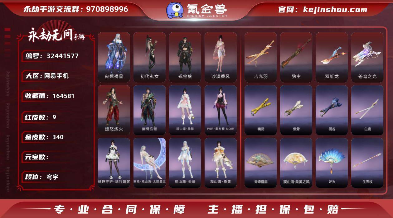 【网易手机】9红 340金 角色红皮: 沙漠香风(迦南),初代玄女(宁红夜),熛怒炼火(季沧海),戎金狼(特木尔),寂烬祸星(季莹莹) 武器红皮: 吉光羽(太刀),狼主(阔刀),双虹龙(双刀),苍穹之光(五眼铳) 2.4可换绑