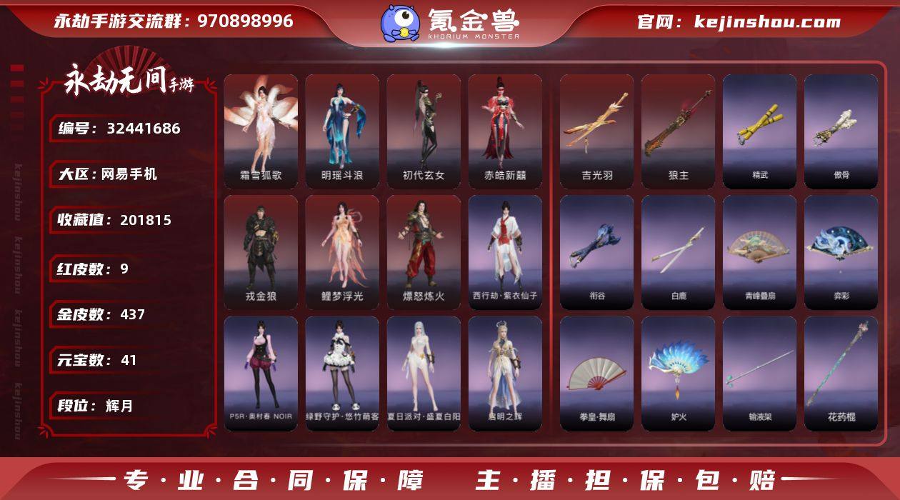 红皮数:9 金皮数:636 收藏值:244369 段位:不灭罗刹 元宝数:3771 幻丝数:604589 初代玄女,赤皓新囍,戎金狼,沙漠香风,熛怒炼火 锦鲤玉扇,吉光羽,狼主,苍穹之光 蝶恋衣,西行劫·蝎子精,芳菲尽,斩神·司令,发丘天官,泠音戏梦·雪恨,夏日派对·半夏晚风,虹猫蓝兔七侠传·虹猫,金财聚辉,观山海·腓腓,绝伦袍,绿野守护·悠竹萌客,P5R·奥村春 NOIR,塔罗序·恶魔,观山海·常羲,夏日派对·盛夏白阳,封神录·哪吒,观山海·夫诸,太平乐,夏日派对·绮夏幻梦,观山海·乘黄,虹猫蓝兔七侠传·蓝兔,斩神·倪克斯,启明之辉,绿野守护·纤羽翎风,夏至·少女心事,怪诞狂想·驯梦绮装,琳琅·2674·暗夜狂掠,三丽鸥家族·酷洛米,雨弈山河,荡魔,怪诞狂想·诡趣幻袍,P5R·雨宫莲 JOKER,朝闻道,代号·冰凌,春日序曲·寒芷,赤丹朱湛,探海裙,封神录·敖丙,怒浪,掌珠仙子,碧水青天,红川仙子,九阴圣女,昆仑圣女,冥神,桃胭花信,九州遗珍·福寿仙,春日序曲·朝颜,兰庭月,智绘·萍之缘,铸神·天禄瑞光,琳琅·塔罗序·女皇,玉剪红绡,决战平安京·御神之刃,耀金·雪魅星尘,阴阳师·赤影妖刀姬,怪诞狂想·街头梦语,耀光天狼,不动明王,冬日绮韵·白熊,金刚心念,梨园传奇·法海,狮威相,云游者,春日序曲·晨风,春桃笑,巅峰极速·小可,流星群侠传·白柔,怦然心动·软暖甜梦,清雅少女,日道神子,日轮之花,三丽鸥家族·凯蒂猫,天钿女命,阴阳姬,御宅罗梦,泠音戏梦·归焰,赤翎之约,巅峰极速·蕾雅,惊云羽,龙门·飞天,逆水寒·恣行无拘,夏至·绮雀之森,夜吻,康复之星,霸道·不良人·天暗星,不良人·李星云,烈豪,瑞火麟,信手斩龙,行云公子,醉山川,观山海·陆吾,无间游戏·飞彪族,八宝龙王,长歌诗韵·戍关将,复制体·尼尔,龙之影·过江龙,煦阳漫叙 绁霞,炸裂,翠影,暗绯无双,泠音戏梦·丛云生,嘶风,夔牛槌,九霄寒,傲骨,精武,衔谷,白鹿,青峰叠扇,弈彩,妒火,观山海·乘黄之风,千堆雪,木棍,输液架,生灭杖,倒马棍,悬玉,道诡异仙·七星铜钱剑,不良人·龙泉剑,2674·超越型,虹猫蓝兔七侠传·冰魄剑,虹猫蓝兔七侠传·长虹剑,壶中日月,隐锋,玉霜龙,阴阳师·伞剑,炎中金,烛神令,谪仙颂·凌风,斩神·前方禁行,冬日绮韵·爪爪糖,断月影,怪诞狂想·双面锤,切影,金玉一文字,雷赐,念珠丸,数珠丸,阴阳师·鬼切,朱络,龙蟠,雷王锯,瑛舞,烛龙引,夏日派对·听浪,夏日派对·西瓜棒冰,残霄,化魄,华夏神兵·马首刀,雪残梅,武道无穷·双蝶,蛋仔派对·咸鱼,绝潮汐,宗蓝,截魄,泠音戏梦·碧缨,沧螺溯浪,残阳镀,玄鲸骨叉,雪夜·清光引,紫焰火尖枪,丹鹤,梦魇,凝冰魄,心魔,迎宵,莲心剑雨,春水,风驰弓,暝蛇引,逆逢,生花,狻猊吼,乌木弓,腥红之月,仙毫,诛神,千机弩,青鸟,御气弩,雪国礼炮,观山海·嘉果花,龙息,龙啸,貔貅吞宝,造景,钻山,出渊蛟,猎犸铳,绿野守护·雨幕,戏祥云,炎魔,醉花风 卖家说:号上还有3700的元宝,端游还有3700的金砖。附带一个逆水寒官服网易账号,姑苏的,号上两颗天赏。和多套限定288时装
