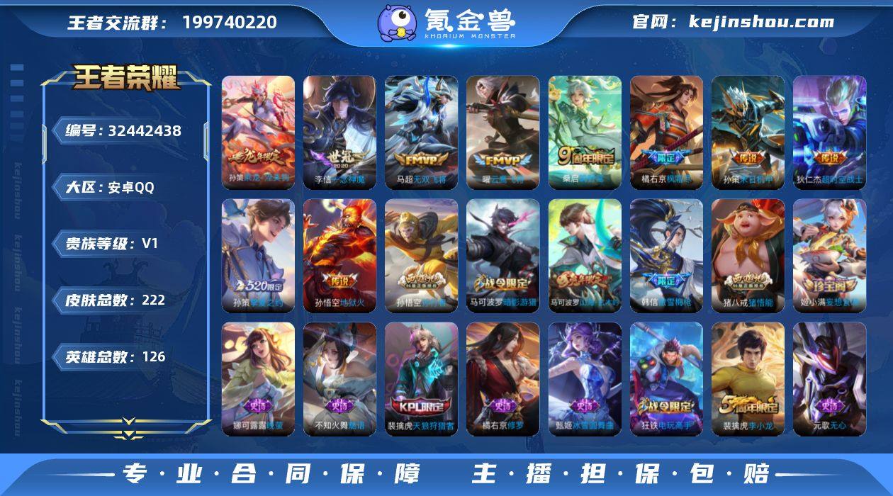 【YX1054】贵族0/皮肤222/传说10/史诗56/英雄126/橘右京全皮/金蝉全皮/鸣野蒿/乘龙·淬吴钩/枫霜尽/无双飞将/挚爱之约/末日机甲-孙策/云鹰飞将/一念神魔/地狱火/超时空战士-狄仁杰/狰(s8)/阴阳师/皇家上将/蔷薇恋人/高山流水/超时空战士-钟无艳/重明(s11)/无心/朔风刀(s17)/落雪兰心/烛龙(s10)/穷奇(s12)/暗影游猎/山海·玄木吟/魔术师/万华元夜(s22)/沙漠行僧(s26)/海滩派对/醍醐杖(s20)/演武夺筹(s23)/傲雪梅枪/午后时光/金庭之子(s27)/孙行者/御旌(s15)/云中旅人(s29)/驱傩正仪(s24)/遇见飞天/真爱魔法/黎明之约/饕餮(s9)/原初探秘者(s21)/五谷丰年/千军破阵(s25)/混沌棋(s18)/顽趣-梦奇/大漠名商(s28)/疑决卦(s19)/天狼狩猎者/李小龙/擒涛扼浪(s31)/御狮(s13)/电玩高手/御霄(s14)/纤云弄巧/御銮(s16)/猪悟能/拒霜思/暖冬·兔眠/探海日志(s32)/匿光追影者/海盐诗旅(s30)/唐三藏/星界游侠/古海寻踪(s33)/百解令(蒙犽)/鬼谷子天穹祈灯(S34)/琥珀纪元伽罗/妄想食味/龙武盛年/剑破天穹(s35)/熔金海岸/电玩·爆裂旋风/奇遇舞章/赏金猎手/永昼/暗渊魔法/修罗/魅语/晚萤/鹰眼统帅/猫狗日记-孙策/星夜王子/功夫厨神/逐浪之夏/天才门将/舞动绿茵/曙光守护者/暗隐猎兽者/乘风破浪/水晶猎...