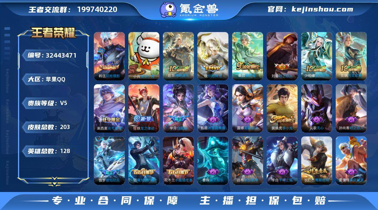 V5 1典藏 4传说 203皮肤 128英雄 【1水晶】韩信-弑枪猎影【4传说】镜-炽阳神光,刘备-时之恋人,桑启-鸣野蒿,后羿-神树通天【40史诗】元歌-无心,阿轲-节奏热浪,白起-星夜王子,百里守约-特工魅影,曹操-幽灵船长,程咬金-功夫厨神,妲己-魅力维加斯,狄仁杰-鹰眼统帅,宫本武藏-鬼剑武藏,花木兰-水晶猎龙者,铠-曙光守护者,兰陵王-暗隐猎兽者,李白-千年之狐,李元芳-逐浪之夏,刘禅-天才门将,露娜-紫霞仙子,吕布-末日机甲,墨子-金属风暴,芈月-白晶晶,墨子-龙骑士,上官婉儿-梁祝,裴擒虎-李小龙,孙策-猫狗日记,孙尚香-水果甜心,孙尚香-时之恋人,夏侯惇-乘风破浪,嬴政-摇滚巨星,张飞-乱世虎臣,赵云-皇家上将,甄姬-冰雪圆舞曲,钟馗-乐园奇幻夜,诸葛亮-黄金分割率,庄周-高山流水,蒙犽-百解令,蒙恬-荣光圣徽,伽罗-琥珀纪元,狂铁-龙之律动,少司缘-巫礼祀神,女娲-万灵启世,莱西奥-光弋星穹