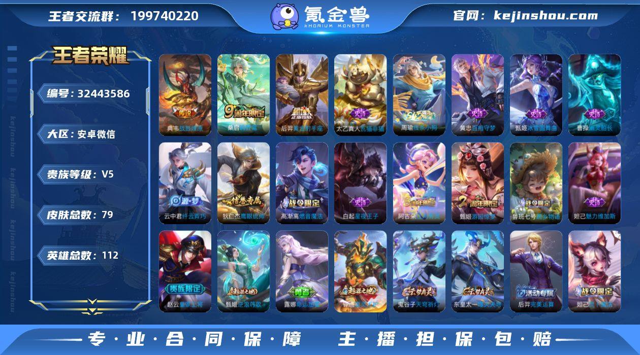 实名: 可修改 性别: 男号 贵族等级: V5 英雄数: 112 皮肤数: 79 传说皮: 黄金射手座,典韦战鼓燎原 限定皮: 游园惊梦,鸣野蒿 亮点: 【优质装备】:黄金射手座