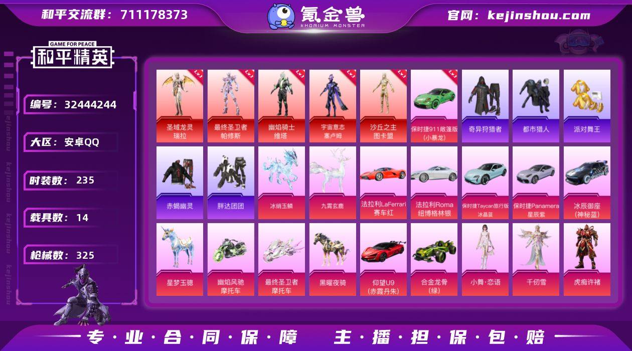 【5红装1个5级 AUG星梦奇缘 小丑赤蝎金鞋都市男神紫螳螂 14载具32特效枪25粉装非常多可以升九级的枪精氪号 极品身法素材号 秒换绑不用等】 安卓Q区-145698热力值-235套装-325枪皮 【5红装】 沙丘之主-图卡盟(1级) 最终圣卫者-帕修斯(5级) 圣域龙灵-瑞拉(1级) 宇宙意志-塞卢姆(1级) 幽焰骑士-维塔(1级)【14载具】 合金龙骨绿色 九霄玄鹿 法拉利LaFerrari(赛车红) 法拉利Roma(纽博格林银) 仰望U9(赤霞丹朱) 最终圣卫者摩托车 星梦玉骢 保时捷Taycan 旅行版(冰晶蓝) 幽焰风驰摩托车 黑曜夜骑 冰辰御座(神秘蓝) 冰绡玉鳞 保时捷Panamera(星辰紫) 保时捷911 敞篷版(小暴龙)(1级)【5稀有】 赤蝎幽灵 都市猎人 派对舞王(金靴子) 派对舞王 萌熊伴侣背包(小熊背包)【25粉装】 初号机款机体服(紫螳螂) 怪诞乔克(小丑) 梦幻火箭 宝贝奶油派 天使彩虹糖 甜心巧克力 洛天依 放客神游 虎痴许褚 月中灵 人物-小舞·恋语 千仞雪 人物-小舞 新星烈龙 繁龙极客 飓风飞鹰 紫电风暴 赤焰黑爵 冷魅冰骑 角色-冷漠罗丽 湮灭星辰 角色-星梦奇缘 角色-智耀战神 角色-圣辉之星 未来领航者【32特效枪】 AUG-星梦奇缘(3级) M416-女娲灵识(3级) Kar98K-圣域龙灵(3级) M416-灵猫魔法师(3级) SCAR-L-...
