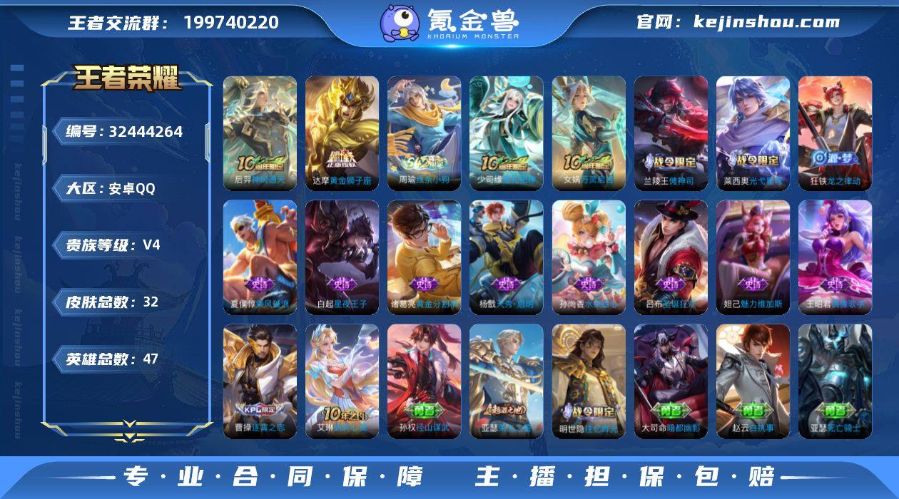 【WZ181462】安卓Q-V4-永恒钻石I段位-47英雄-32皮肤-3传说-13史诗【英雄全皮】:孙权全皮,敖隐全皮【传说皮肤】:云缨神骥越千峰,后羿神树通天,达摩黄金狮子座【限定皮肤】:狄仁杰阴阳师,项羽海滩派对【赛季限定】:亚瑟荣光之誓【战令限定】:兰陵王傩神司,莱西奥光弋星穹,明世隐往忆晖光,周瑜线条小狗【史诗皮肤】:周瑜线条小狗,少司缘巫礼祀神,女娲万灵启世,兰陵王傩神司,莱西奥光弋星穹,狂铁龙之律动,杨戬天秀启明,白起星夜王子,诸葛亮黄金分割率,夏侯惇乘风破浪,吕布圣诞狂欢,妲己魅力维加斯,孙尚香水果甜心,王昭君偶像歌手【其他皮肤】:曹操逐霄之志,艾琳鹤鸣心笺,孙权径山谋武,明世隐往忆晖光,亚瑟荣光之誓,大司命暗都幽影,关羽龙腾万里,狄仁杰阴阳师,亚瑟死亡骑士,孙膑天使之翼,赵云白执事,项羽海滩派对,元歌午夜歌剧院,百里守约绝影神枪【营地ID】:1590915186