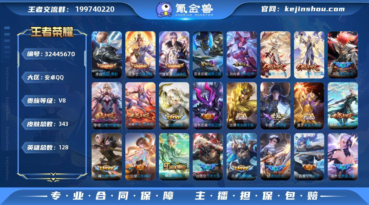 安卓Q-V8-最强王者段位-128英雄-293皮肤-2典藏皮肤-14传说-96史诗【英雄全皮】:孙权全皮,李信全皮,猪八戒全皮,影全皮,海诺全皮【荣耀典藏】:孙悟空全息碎影,虞姬神鉴启示录【传说皮肤】:李信山海炽霜斩,孙策挚爱之约,露娜启示之音,曜李逍遥 ,诸葛亮时雨天司,虞姬启明星使,李信一念神魔,伽罗太华,貂蝉猫影幻舞,干将莫邪久胜战神,百里玄策白虎志,貂蝉仲夏夜之梦,宫本武藏地狱之眼,吕布天魔缭乱【限定皮肤】:白起狰,姜子牙天穹之誓,狄仁杰阴阳师,虞姬凯尔特女王,赵云皇家上将,赵云龙胆,墨子神迹守卫,妲己时之彼端,嬴政白昼王子,孙尚香蔷薇恋人,鲁班七号狮舞东方,庄周蜃楼王,庄周高山流水,阿轲迷踪丽影,孙膑妖精王,扁鹊炼金王,白起夜都怪侠,芈月重明,芈月幻夜卜梦,吕布天魔缭乱,吕布猎兽之王,周瑜赤莲之焰,元歌云间偶戏,元歌无心,夏侯惇朔风刀,甄姬幽恒,甄姬游园惊梦,曹操烛龙,曹操天狼征服者,典韦穷奇,典韦蓝屏警告,马可波罗逐梦之星,马可波罗暗影游猎,狄仁杰魔术师,狄仁杰万华元夜,达摩星际陆战队,达摩沙漠行僧,项羽海滩派对,老夫子醍醐杖,老夫子航海奇遇记,安琪拉魔法小厨娘,程咬金演武夺筹,露娜启示之音,刘...