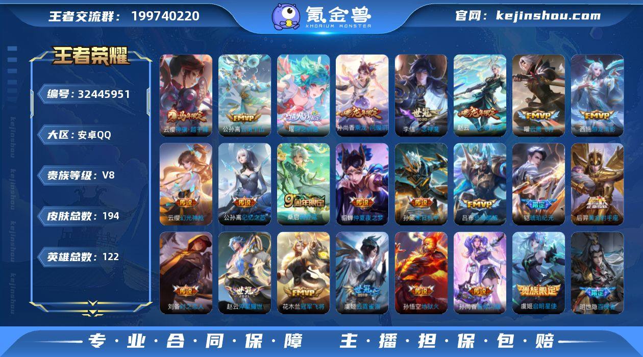 安卓QQ/V8/尊贵铂金/372皮肤/124英雄/2典藏/0珍品无双/0无双/0珍品传说/10传说/101史诗/9稀有英雄 【2 典藏皮肤】九霄神辉 花木兰,最初的交响 伽罗, 【10 传说皮肤】启明星使 虞姬,零号·赤焰 孙悟空,异界灵契 孙尚香,一念神魔 李信,淬星耀世 赵云,太华 伽罗,绛天战甲 铠,冠军飞将 花木兰,愿照·岁时盈 虞姬,鸣野蒿 桑启, 【101 史诗皮肤】电玩小子 鲁班七号,末日机甲 吕布,白昼王子 嬴政,蔬乡物语 鲁班七号,紫霞仙子 露娜,百解令 蒙犽,高山流水 庄周,银河之约 李元芳,暗影游猎 马可波罗,燃音魔法 高渐离,冰霜恋舞曲 干将莫邪,白鹤梁神女 大乔,苍穹之光 项羽,天秀·启明 杨戬,狮舞东方 鲁班七号,猫狗日记 大乔,德古拉伯爵 刘邦,心灵战警 亚瑟,五谷丰年 鬼谷子,无心 元歌,鬼剑武藏 宫本武藏,迷踪丽影 阿轲,星夜王子 白起,地狱燃心 司空震,遇见飞天 杨玉环,摇滚巨星 嬴政,电玩高手 狂铁,冰锋战神 关羽,修罗 橘右京,拒霜思 嫦娥,魅力维加斯 妲己,如梦令 嫦娥,偶像歌手 王昭君,霸王别姬 虞姬,女仆咖啡 妲己,星界游侠 暃,舞动绿茵 蔡文姬,繁星吟游 蔡文姬,暗夜贵公子 嬴政,鹰眼统帅 狄仁杰,胡桃异想国 米莱狄,李小龙 裴擒虎,纤云弄巧 云中君,驯魔猎人 兰陵王,如梦令 后羿,龙骑士 墨子,金属风暴 墨子,傲雪梅枪 韩信,特工魅影 百里守约,猫狗日记 孙策,逐浪之夏 李元芳,未来纪元 赵云,优雅恋人 嬴政,鸭鸭历险记 刘禅,驭风魔法 戈娅,魔术师 狄仁杰,龙之律动 狂铁,皇家上将 赵云,冰冠公主 雅典娜,涂山红红 少司缘,功夫厨神 程咬金,东方月初 大司命,梁祝 上官婉儿,电玩·爆裂旋风 刘禅,天才门将 刘禅,圣诞恋歌 貂蝉,云间偶戏 元歌,水晶猎龙者 花木兰,破空之剑 亚连,圣诞狂欢 吕布,青焰无极 镜,夏日便利店 蔡文姬,天狼溯光者 伽罗,地狱岩魂 廉颇,茶境仙 孙膑,冰雪圆舞曲 甄姬,火炮绅士 黄忠,默契交锋 花木兰,航海奇遇记 老夫子,...
