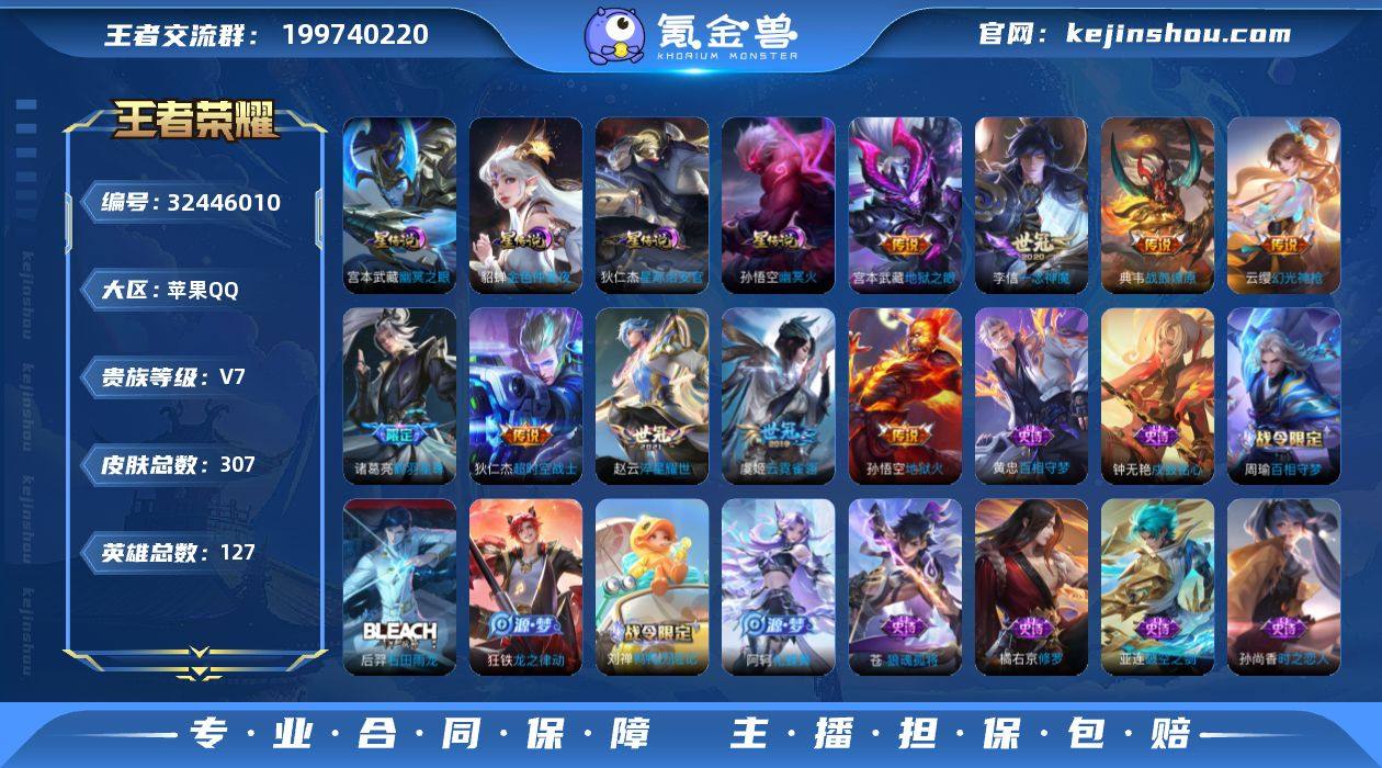 【店长主推精氪号·愿照九州拓·鹤羽星尊·山海玄木吟·淬星耀世·云霓雀翎·无二次包过】w20078-苹果Q-127英雄-307皮肤-14王者印记-260铭文-贵族积分2w【贵族7】【4星传说·12传说·9按键·342幸运值】【因赛季更新游戏段付以上号为准!】 【英雄全皮】:孙权全皮,苍全皮,敖隐全皮,蒙恬全皮,空空儿全皮,影全皮 【星元皮肤】:孙悟空幽冥火,宫本武藏幽冥之眼,貂蝉金色仲夏夜,狄仁杰星际治安官 【传说皮肤】:后羿神树通天,澜愿照九州拓,云缨幻光神枪,桑启鸣野蒿,典韦战鼓燎原,诸葛亮鹤羽星尊,赵云淬星耀世,李信一念神魔,虞姬云霓雀翎,宫本武藏地狱之眼,孙悟空地狱火,狄仁杰超时空战士 【限定皮肤】:蒙犽顽岩魄,大乔绒语心约,姜子牙天穹之誓,杨戬破阵退雄兵,狄仁杰阴阳师,赵云皇家上将,高渐离玩趣恶龙,钟无艳超时空战士,元歌无心,甄姬落雪兰心,马可波罗山海玄木吟,狄仁杰魔术师,狄仁杰万华元夜,达摩沙漠行僧,项羽海滩派对,程咬金演武夺筹,兰陵王金庭之子,李元芳匿光侦查者,李元芳云中旅人,钟馗驱傩正仪,雅典娜黎明之约,鬼谷子五谷丰年,诸葛亮鹤羽星尊,苏烈千军破阵,百里玄策原初追逐者,梦奇顽趣,沈梦溪大漠名商,裴擒虎李小龙,裴擒虎擒涛...