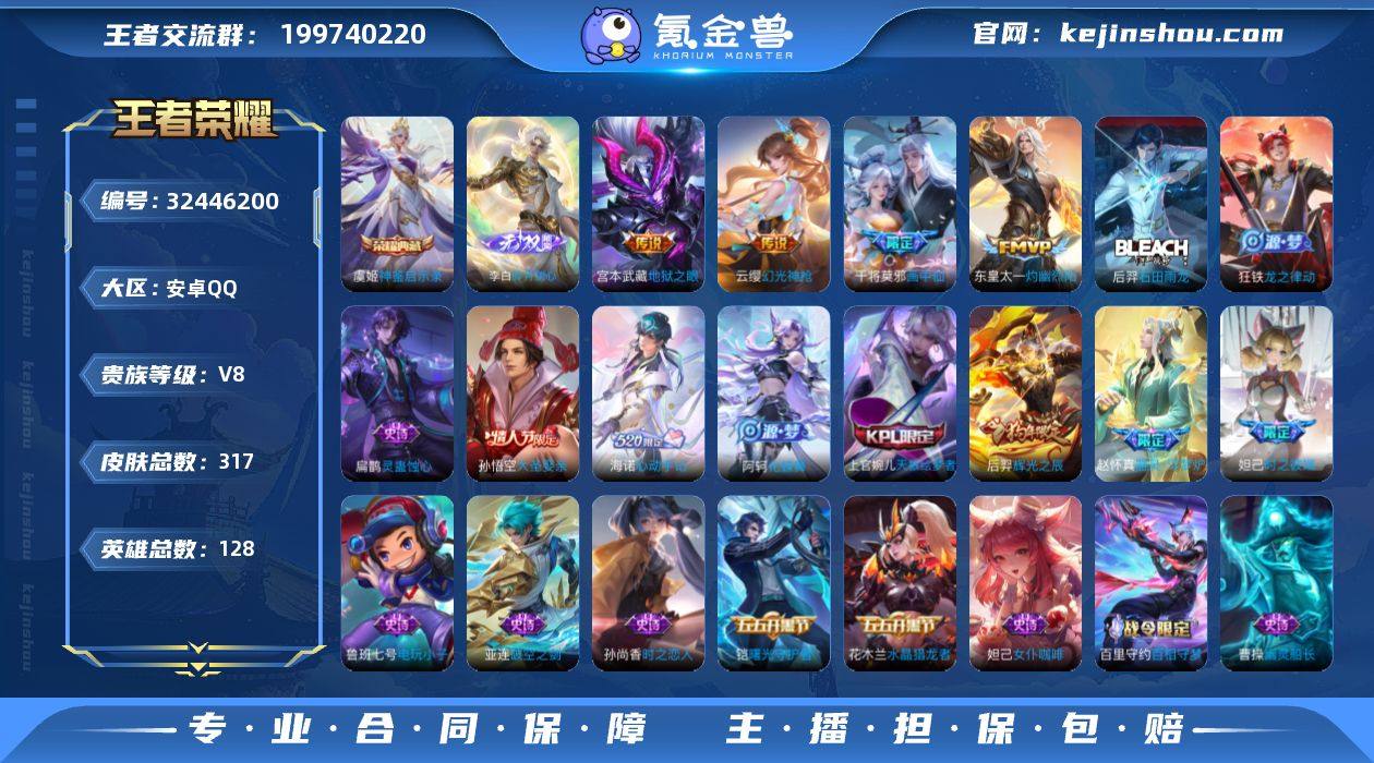 V8 2典藏 1无双 2珍品传说 12传说 128英雄 317皮肤 可修改实名 男号 【英雄全皮】敖隐全皮,孙权全皮,蚩奼全皮,姜子牙全皮,海诺全皮,鬼谷子全皮,米莱狄全皮,影全皮,大禹全皮 【稀有英雄】敖隐(小龙人),大司命,嬴政(始皇帝),韩信(韩跳跳),夏洛特(夏师傅),艾琳,橘右京(橘子),娜可露露(鸟人),不知火舞,赵云,金蝉(唐僧),戈娅 【荣耀水晶】神鉴启示录,千魇归渊 【无双皮】碎月剑心(李白无双) 【珍品传说】沧流箭,怪盗基德 【传说皮】幻光神枪,长夜焕生,地狱之眼,末日机甲-孙尚香(绿蚂蚱),超时空战士-狄仁杰,画中仙,灼幽烈阳,澜逐花归海 【珍宝阁皮】万物之道,蔷薇恋人,女武神 【赛季/战令皮】噬灭天穹(s37),古海寻踪(s33),海盐诗旅(s30),擒涛扼浪(s31),流音漫舞,顽趣-梦奇,剑破天穹(s35),天穹祈灯(s34),天穹之誓(s36),蔡文姬夏日便利店,虞姬夏日便利店,凯尔特女王(s7),饕餮(s9),烛龙(s10),御霄(s14),御銮(s16),朔风刀(s17),混沌棋(s18),疑决卦(s19),醍醐杖(s20),原初探秘者(s21),万华元夜(s22),演武夺筹(s23),驱傩正仪(s24),银河之约,潮玩骑士王,云间偶戏,胡桃异想国,沙漠行僧(s26),金庭之子(s27),午后时光,大漠名商(s28),云中旅人(s29),落雪兰心 【史诗皮】破空之剑,星界特工,星界...