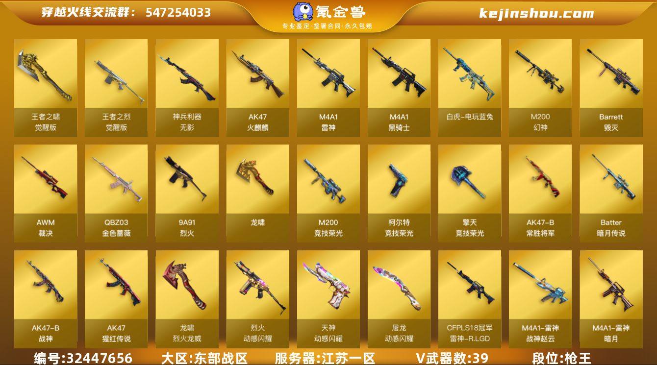 【ky6355】江苏一区-49V-2王者武器数-0炫金武器数 【热门武器】:QBZ03-金色蔷薇,M200-幻神,M200-竞技荣光,白虎-电玩蓝兔,M4A1-黑骑士,USP-雷暴 【音效卡】:M4A1-黑骑士音效卡 【皮肤】:M200-幻神-黄忠皮肤,幻神-动感闪耀 皮肤,幻神-荣耀世冠EP 皮肤,幻神-电竞之星 皮肤,裁决-星际旅行 皮肤,雷神-暗月,M4A1-战神赵云,雷神-R.LGD-CFPLS18冠军,M4A1-再燃火线,毁灭-暗月,毁灭-冠军之怒,毁灭-虹光风暴 皮肤,毁灭-英雄计划 皮肤,战神-紫绶金章皮肤,战神-流金岁月皮肤,AK47-B-常胜将军-刘备,AK47-B-常胜将军-孙权,修罗-能量核心,轻型军用手斧-再燃火线 【角色】:魅影,电竞教官-云悠悠,王者葵-惊若翩鸿,乔伊教练,葵-阿尔法武装,幻面灵狐,初恋灵狐,飞虎队-X,风暴女,虎妞,嘉年华灵狐,灵动武士,龙儿-小淘气,麻雀,潘多拉-X,潘多拉-甜心教官,斯沃特-X,蜀雪,新娜塔莎,雪莉杨-摸金校尉,樱-战斗天使,影武者-X 【人偶武器】:天龙-曼陀罗,火麒麟-灵狐,QBZ03-街机-飒爽刀锋,AWM-灵狐-15周年嘉年华,深渊终结者手雷,迷你艾比,迷你超能女侍 【挑战大师】:冰龙粉碎者-白马银枪,激光毁灭者III-白马银枪,神圣爆裂者-末日III 【英雄级武器】...