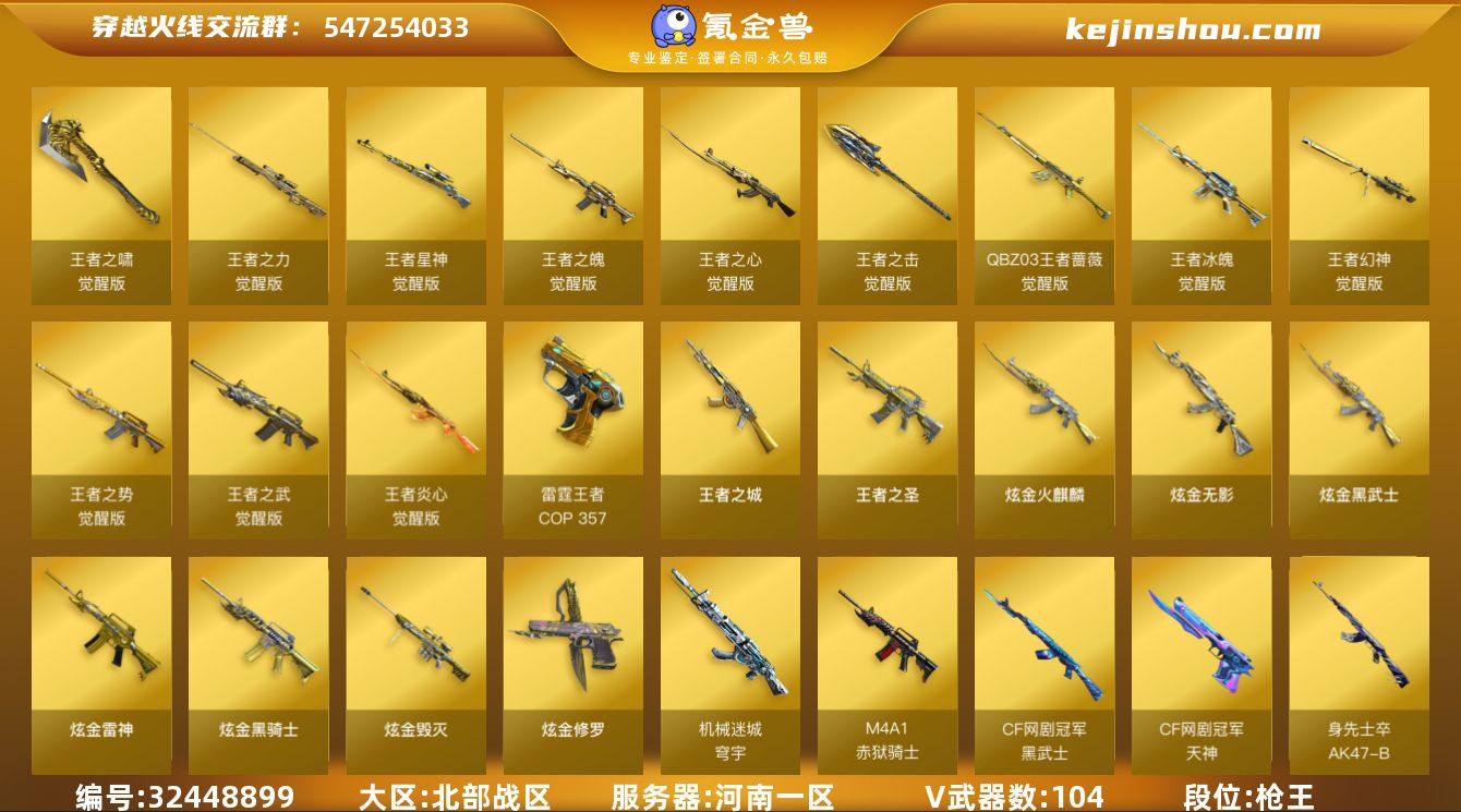河南一区-123V-22王者武器数-7炫金武器数 【热门武器】:QBZ03-金色蔷薇*2,Scar Light-白虎,HK417-朱雀,M4A1-青龙,M200-幻神,M200-竞技荣光,死亡之眼*4,M4A1-黑骑士,汤姆逊-烈龙*9,RPK-盘龙*3,加特林-炼狱,羊驼玩偶,火麒麟-绝迹,USP-雷暴,COP 357-雷霆王者,沙鹰-修罗 【王者炫金武器】:王者之圣,王者之城,COP 357-雷霆王者,炫金火麒麟,炫金骑士,炫金无影,炫金雷神,炫金武士,炫金毁灭,炫金修罗,王者之魄闪光弹 【音效卡】:AK47-火麒麟音效卡,Barrett-极光音效卡,Scar Light-白虎音效卡 【皮肤】:M200-幻神-黄忠皮肤,Scar Light-白虎-暗星,烈龙-星空,雷神-星空,雷神-虎将,雷神-耀金皮肤,雷神-R.LGD-CFPLS18冠军,雷神-烈虎皮肤,雷神-荣耀世冠AG,火麒麟-雷神,火麒麟-华夏之心,AK47-火麒麟-传奇EVEN,火麒麟-平天大圣*2,毁灭-暗月*2,毁灭-星空,黑龙-暗月,M4A1-黑龙-361*2,黑骑士-暗月*3,黑骑士耀金皮肤,无影-暗月,无影-能量核心,死神-秘银*2,AK47-黑武士-361,天启-暗月,战神-粉色甜心皮肤*2,战神-紫绶金章皮肤*3,AK47-B-常胜将军-曹操*2,AK47-B-常胜将军-刘备,AK47-B-常胜将军-孙权*3,天龙-秘银,天龙-能量核心,AWM-天...