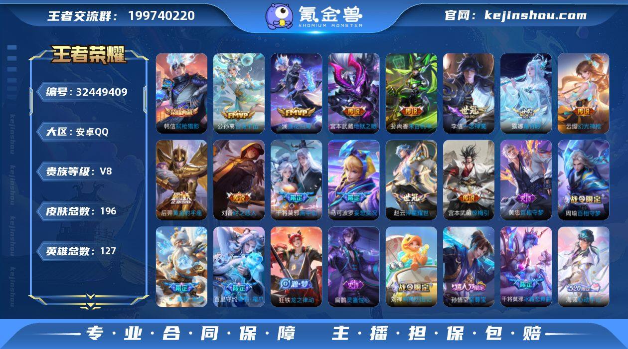 安卓Q-V0-最强王者段位-128英雄-366皮肤-2典藏皮肤-1典藏英雄-1无双-28传说-102史诗 【英雄全皮】:孙权全皮,影全皮 【荣耀典藏】:武则天英雄,孙尚香杀手不太冷,貂蝉幻阙歌 【无双皮肤】:李白碎月剑心 【传说皮肤】:后羿神树通天,孙尚香乘龙问璇玑,赵云乘龙铭钟鼎,东皇太一灼幽烈阳,亚瑟追逃游戏,安琪拉追逃游戏,瑶时之祈愿,赵云淬星耀世,西施游龙清影,曜李逍遥 ,周瑜音你心动,小乔音你心动,公孙离祈雪灵祝,镜炽阳神光,虞姬启明星使,李信一念神魔,刘备时之恋人,貂蝉猫影幻舞,张良黄金白羊座,干将莫邪久胜战神,百里玄策白虎志,梦奇胖达荣荣,后羿黄金射手座,诸葛亮武陵仙君,宫本武藏地狱之眼,吕布天魔缭乱,武则天海洋之心,狄仁杰超时空战士 【限定皮肤】:白起狰,蒙犽顽岩魄,蔡文姬夏日便利店,大乔绒语心约,虞姬夏日便利店,姜子牙天穹之誓,狄仁杰阴阳师,虞姬凯尔特女王,赵云皇家上将,墨子神迹守卫,嬴政优雅恋人,嬴政白昼王子,庄周蜃楼王,庄周云端筑梦师,庄周高山流水,高渐离死亡摇滚,高渐离玩趣恶龙,钟无艳王者之锤,孙膑妖精王,孙膑天狼运算者,扁鹊炼金王,芈月重明,芈月白晶晶,吕布天魔缭乱,吕布猎兽之王,元歌云间偶...