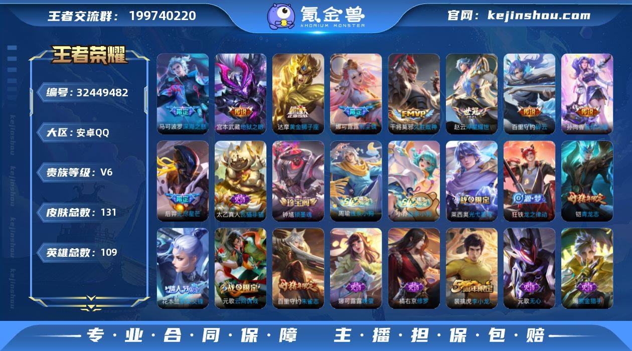 MCK631508 皮肤数量131 印记总数1 【V6】 【尊贵铂金】 【可修改】 账号类型2 传说9 史诗35 账号类型:打野号,射手号; 传说:宫本武藏_地狱之眼,百里守约_碎云,娜可露露_前尘镜,干将莫邪_久胜战神,赵云_淬星耀世,孙尚香_音你闪耀,后羿_无尽星芒,马可波罗_深海之息,达摩_黄金狮子座; 史诗:曹操_幽灵船长,太乙真人_瓦猫非猫,钟馗_锁墨魂,小乔_线条小狗,元歌_无心,王昭君_偶像歌手,周瑜_线条小狗,狂铁_龙之律动,莱西奥_光弋星穹,雅典娜_冰冠公主,吕布_末日机甲,鬼谷子_五谷丰年,廉颇_地狱岩魂,百里守约_特工魅影,妲己_热情桑巴,娜可露露_晚萤,狄仁杰_魔术师,百里守约_朱雀志,貂蝉_唤灵魅影,橘右京_修罗,铠_青龙志,高渐离_天秀音浪,赵云_皇家上将,夏侯惇_匿光决锋者,澜_赏金猎手,杨戬_天秀启明,夏洛特_永昼,嫦娥_拒霜思,元歌_云间偶戏,李白_千年之狐,花木兰_默契交锋,蒙犽_狂想玩偶喵,裴擒虎_李小龙,狄仁杰_鹰眼统帅,妲己_魅力维加斯;