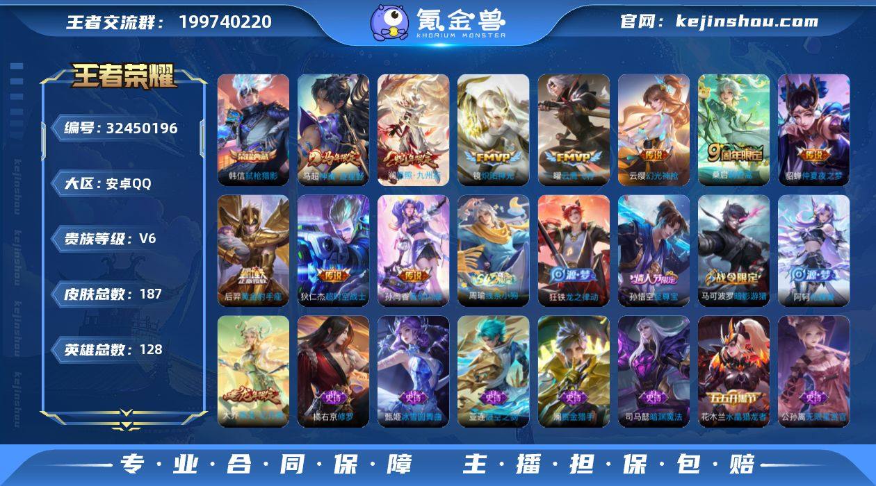 安卓Q-V6-最强王者段位-128英雄-187皮肤-1典藏皮肤-10传说-44史诗 【英雄全皮】:孙权全皮,影全皮 【荣耀典藏】:韩信弑枪猎影 【传说皮肤】:马超神骥逐星野,澜愿照九州拓,云缨幻光神枪,桑启鸣野蒿,孙尚香音你闪耀,镜炽阳神光,曜云鹰飞将,后羿黄金射手座,貂蝉仲夏夜之梦,狄仁杰超时空战士 【限定皮肤】:蒙犽顽岩魄,蔡文姬夏日便利店,大乔绒语心约,虞姬夏日便利店,姜子牙天穹之誓,狄仁杰阴阳师,赵云皇家上将,夏侯惇朔风刀,典韦穷奇,马可波罗暗影游猎,狄仁杰魔术师,狄仁杰万华元夜,项羽海滩派对,老夫子醍醐杖,程咬金演武夺筹,孙悟空至尊宝,钟馗驱傩正仪,鬼谷子原初探秘者,弈星混沌棋,明世隐疑决卦,狂铁御狮,云中君纤云弄巧,艾琳女武神,阿古朵江河有灵,张良古海寻踪,高渐离燃音魔法,妲己灵卜魔法,鬼谷子天穹祈灯,大乔乘龙忆丹青,沈梦溪龙舞盛年,鲁班七号蔬乡物语,李元芳蔬乡物语,刘邦剑破天穹,程咬金群星魔术团,刘备异域游侠,周瑜熔金海岸 【年限皮肤】:大乔乘龙忆丹青,澜愿照九州拓 【赛季限定】:典韦穷奇,狂铁御狮,夏侯惇朔风刀,弈星混沌棋,明世隐疑决卦,老夫子醍醐杖,鬼谷子原初探秘者,狄仁杰万华元夜,程咬金演武...