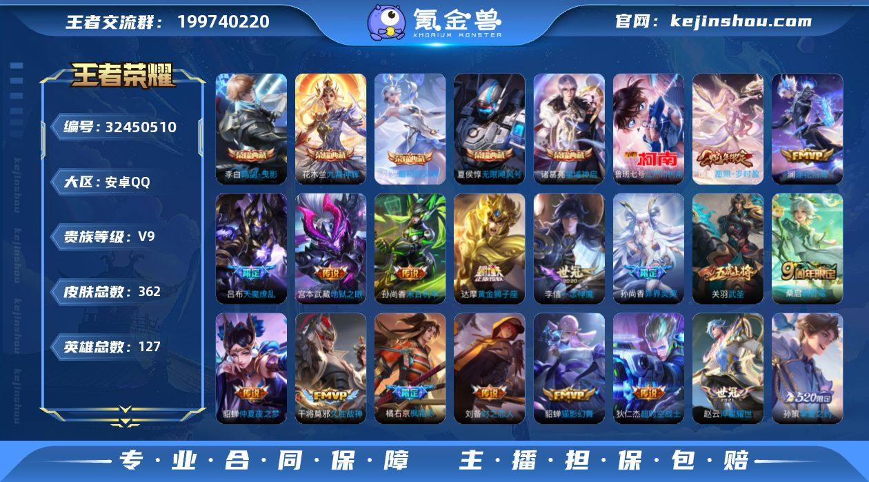 安卓Q-V9-最强王者段位-127英雄-362皮肤-5典藏皮肤-1珍品传说-27传说-106史诗 【英雄全皮】:孙权全皮,橘右京全皮,敖隐全皮,空空儿全皮,影全皮 【荣耀典藏】:夏侯惇无限飓风号,李白鸣剑曳影,诸葛亮星域神启,花木兰九霄神辉,伽罗最初的交响 【珍品传说】:鲁班七号江户川柯南 【传说皮肤】:虞姬愿照岁时盈,桑启鸣野蒿,澜逐花归海,东皇太一灼幽烈阳,百里守约碎云,橘右京枫霜尽,孙策挚爱之约,露娜启示之音,孙尚香异界灵契,赵云淬星耀世,王昭君乞巧织情,虞姬启明星使,关羽武圣,李信一念神魔,刘备时之恋人,貂蝉猫影幻舞,干将莫邪久胜战神,虞姬云霓雀翎,达摩黄金狮子座,花木兰冠军飞将,梦奇胖达荣荣,貂蝉仲夏夜之梦,孙尚香末日机甲,宫本武藏地狱之眼,孙悟空地狱火,吕布天魔缭乱,狄仁杰超时空战士 【限定皮肤】:白起狰,狄仁杰阴阳师,虞姬凯尔特女王,赵云皇家上将,嬴政优雅恋人,嬴政白昼王子,孙尚香异界灵契,鲁班七号狮舞东方,庄周云端筑梦师,钟无艳超时空战士,白起夜都怪侠,芈月重明,吕布天魔缭乱,吕布猎兽之王,周瑜赤莲之焰,元歌无心,夏侯惇朔风刀,甄姬落雪兰心,曹操烛龙,曹操天狼征服者,典韦穷奇,典韦岱宗,马可波罗山...