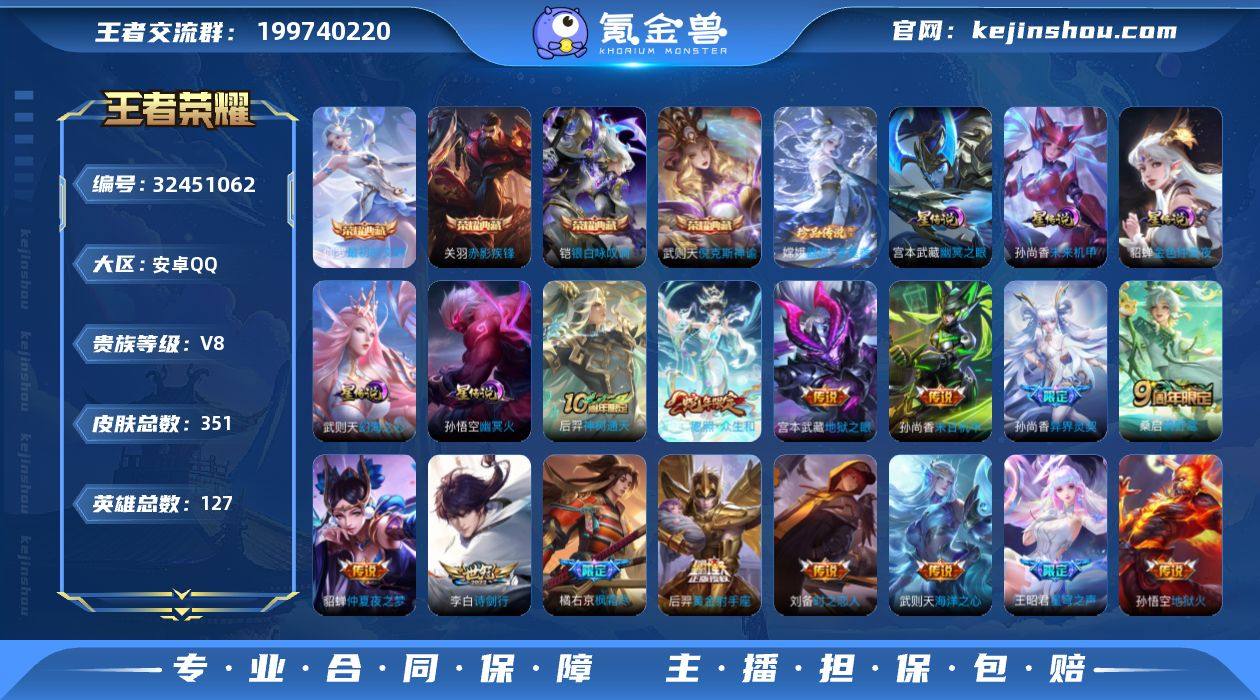 【特价急出/详情看图】安卓Q-V8-最强王者段位-127英雄-351皮肤-4典藏皮肤-1典藏英雄-1珍品传说-6星元-17传说-100史诗 【英雄全皮】:猪八戒全皮,影全皮 【荣耀典藏】:武则天英雄,武则天倪克斯神谕,关羽赤影疾锋,铠银白咏叹调,伽罗最初的交响 【珍品传说】:嫦娥器灵落星盏 【传说皮肤】:后羿神树通天,妲己愿照众生和,桑启鸣野蒿,东皇太一灼幽烈阳,李白诗剑行,王昭君星穹之声,橘右京枫霜尽,孙尚香异界灵契,铠绛天战甲,虞姬启明星使,刘备时之恋人,后羿黄金射手座,貂蝉仲夏夜之梦,孙尚香末日机甲,宫本武藏地狱之眼,孙悟空地狱火,武则天海洋之心 【限定皮肤】:白起狰,蒙犽顽岩魄,姜子牙天穹之誓,狄仁杰阴阳师,虞姬凯尔特女王,赵云皇家上将,墨子神迹守卫,妲己热情桑巴,嬴政优雅恋人,嬴政白昼王子,孙尚香蔷薇恋人,孙尚香异界灵契,鲁班七号狮舞东方,庄周高山流水,高渐离死亡摇滚,高渐离玩趣恶龙,阿轲迷踪丽影,钟无艳王者之锤,钟无艳超时空战士,孙膑天狼运算者,芈月重明,芈月幻夜卜梦,吕布猎兽之王,吕布御风骁将,周瑜赤莲之焰,元歌云间偶戏,元歌无心,夏侯惇朔风刀,甄姬落雪兰心,曹操烛龙,曹操天狼征服者,典韦穷奇,典韦蓝屏警...