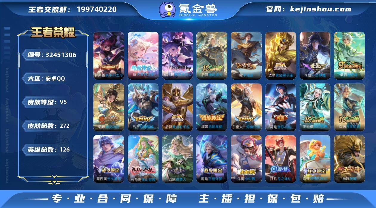 【特价出售/店主推荐】:安卓Q-V8-尊贵铂金II段位-126英雄-272皮肤-1典藏皮肤-2珍品传说-11传说-78史诗 【英雄全皮】:刘禅全皮,东皇太一全皮 【荣耀典藏】:孙尚香杀手不太冷 【珍品传说】:安琪拉酷洛米之心,瑶大耳狗之梦 【传说皮肤】:后羿神树通天,桑启鸣野蒿,东皇太一灼幽烈阳,吕布怒海麟威,貂蝉遇见胡旋,曜李逍遥 ,周瑜音你心动,虞姬启明星使,李信一念神魔,达摩黄金狮子座,后羿黄金射手座 【限定皮肤】:姜子牙天穹之誓,杨戬破阵退雄兵,狄仁杰阴阳师,赵云皇家上将,墨子神迹守卫,嬴政优雅恋人,庄周云端筑梦师,庄周高山流水,高渐离玩趣恶龙,元歌云间偶戏,元歌无心,夏侯惇朔风刀,甄姬游园惊梦,马可波罗暗影游猎,狄仁杰魔术师,狄仁杰万华元夜,达摩沙漠行僧,项羽海滩派对,项羽霸王别姬,老夫子醍醐杖,老夫子航海奇遇记,貂蝉遇见胡旋,程咬金演武夺筹,兰陵王金庭之子,亚瑟潮玩骑士王,孙悟空孙行者,后羿圣弓游侠,李元芳云中旅人,虞姬启明星使,钟馗神迹守卫,钟馗驱傩正仪,干将莫邪真爱魔法,蔡文姬繁星吟游,东皇太一逐梦之光,鬼谷子原初探秘者,鬼谷子五谷丰年,铠青龙志,苏烈千军破阵,弈星混沌棋,沈梦溪大漠名商,明世隐疑决卦...