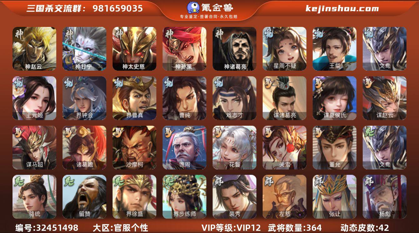 【420】官阶:大将军;VIP等级:VIP12;史诗武将数量:42;动态皮肤数量:42;武将总数:364;史诗宝珠数量:18;将魂数量:7761;神将:7;魏国史诗武将:18;蜀国史诗武将:10;吴国史诗武将:4;群史诗武将:16