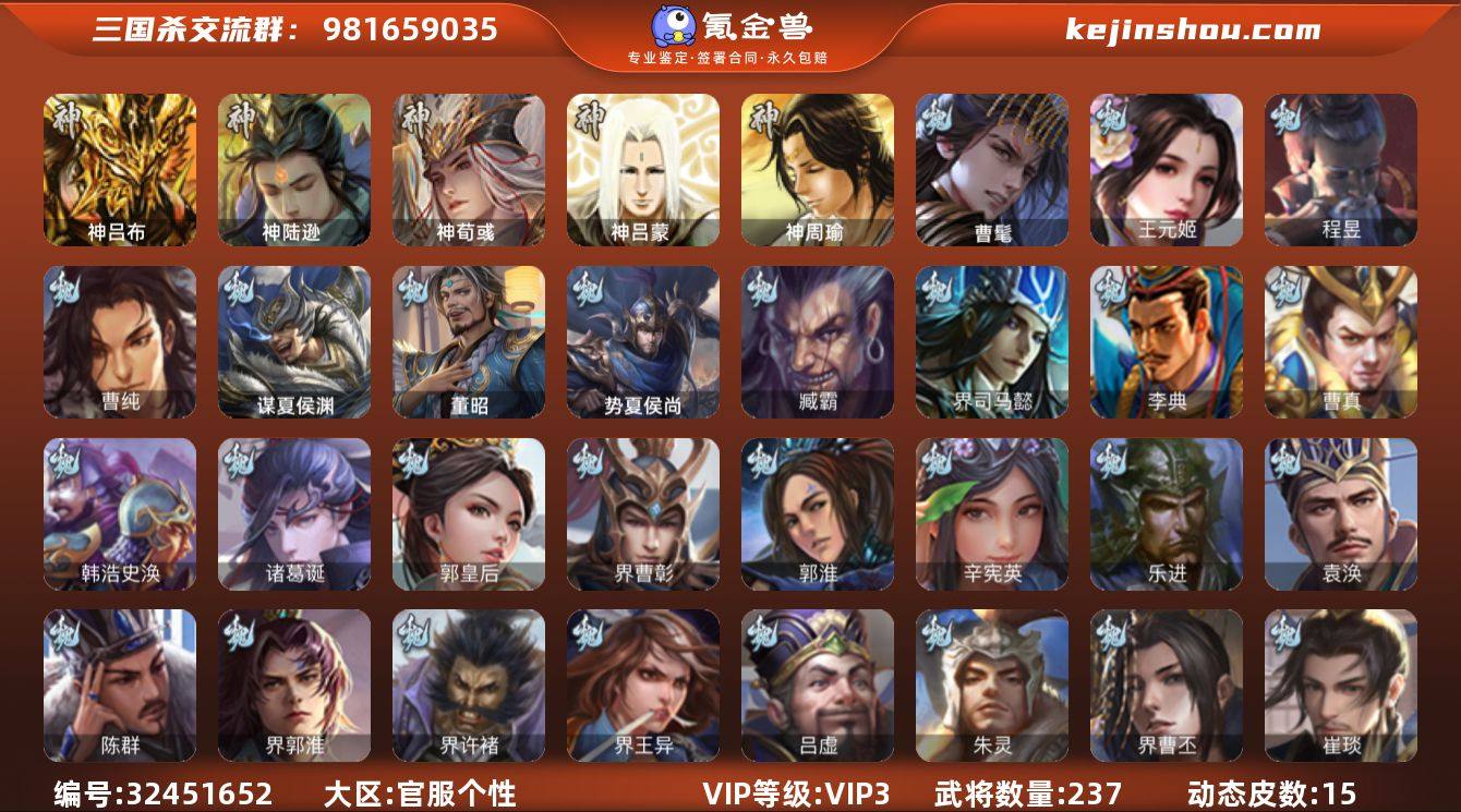 官阶:骠骑将军;VIP等级:VIP3;史诗武将数量:13;动态皮肤数量:15;武将总数:237;史诗宝珠数量:0;将魂数量:3535;神将:3;魏国史诗武将:8;蜀国史诗武将:3;吴国史诗武将:1;群史诗武将:2