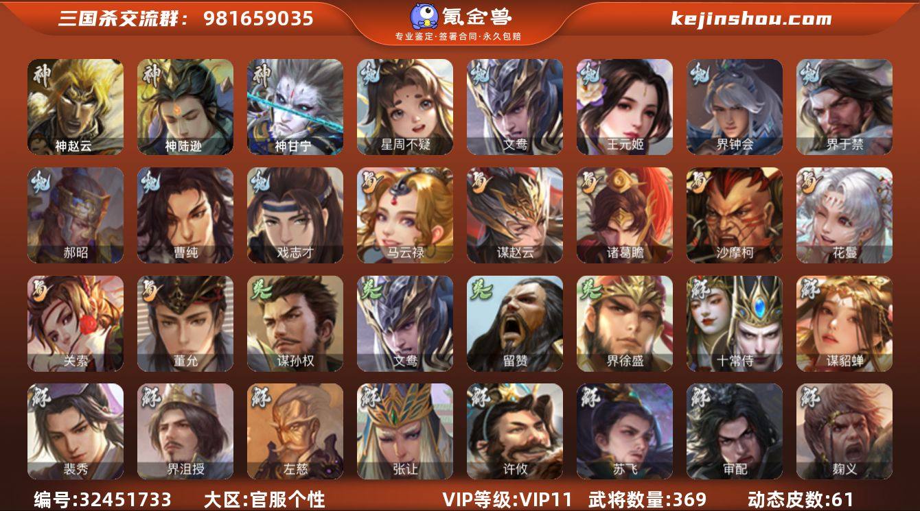 【427】官阶:大将军;VIP等级:VIP11;史诗武将数量:37;动态皮肤数量:61;武将总数:369;史诗宝珠数量:11;将魂数量:666;神将:5;魏国史诗武将:15;蜀国史诗武将:7;吴国史诗武将:3;群史诗武将:19