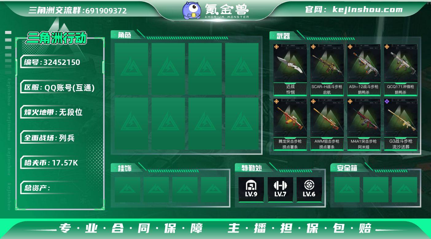 【LX44634】【总资产:207.4m,流动资产:169.9m-2干员红皮:红狼 蚀金玫瑰,骇爪 维什戴尔-刀皮:信条】 挂饰:黑夜猎手-赛季3x3-78发aw子弹-60烽火等级-钻石-7战场等级-列兵 【干员外观】:红狼-蚀金玫瑰,骇爪-维什戴尔,红狼-电锯惊魂 【近战皮肤】:近战-信条,近战-黑鹰 【传说外观】:M4A1突击步枪-蚀金玫瑰,M4A1突击步枪-阿米娅,SCAR-H战斗步枪-启航,KC17突击步枪-电锯惊魂,R93狙击步枪-维什戴尔 【史诗外观】:腾龙突击步枪-猎鳄行动,MP5冲锋枪-战术竞备,MP5冲锋枪-竞技风,Vector冲锋枪-猎鳄行动,M700狙击步枪-哈夫克警备 【稀有外观】:M700狙击步枪-旧梦,M4A1突击步枪-零点,M4A1突击步枪-街头艺术,AKM突击步枪-肃杀,K416突击步枪-碳纤维,M7战斗步枪-捣蛋鬼,AK-12突击步枪-零点,SCAR-H战斗步枪-荣耀列队,CAR15突击步枪-亚特兰蒂斯,腾龙突击步枪-冰天雪地,MP5冲锋枪-弄臣,MP5冲锋枪-哈夫克卫队,P90冲锋枪-捣蛋鬼,Vector冲锋枪-先锋,UZI冲锋枪-亚特兰蒂斯,SMG-45-行动开启,SMG-45冲锋枪-幻影结构,勇士冲锋枪-冰天雪地,QJB201轻机枪-哈夫克卫队,Mini-14射手步枪-荣耀列队,SVD狙击步枪-战术行动,SKS射手步枪-弄臣,SV-98狙击步枪-星链科技,SV-98狙击步枪-哈夫克航天,SV-98狙击步枪-精英联盟 【普通外观】:勇士冲锋枪-旧工业,M7战斗步枪-噬菌体,勇士冲锋枪-噬菌体,M4A1突击步枪-粉色涂装,M4A1突击步枪-高雅黑,QBZ95-1突击步枪-高雅黑,QBZ95-1突击步枪-海浪,QBZ95-1突击步枪-海色,K416突击步枪-几何迷彩,K416突击步枪-高雅黑,M16A4突击步枪-高雅黑,AUG突击步枪-浅蓝涂装,M7战斗步枪-红色涂装,SG552突击步枪-浅蓝涂装,SG552突击步枪-海浪,SCAR-H战斗步枪-数码迷彩,G3战斗步枪-高雅黑,PTR-32突击步枪-黄蜂,MP5冲锋枪-海色,MP5冲锋枪-黄蜂,Vector冲锋枪-几...