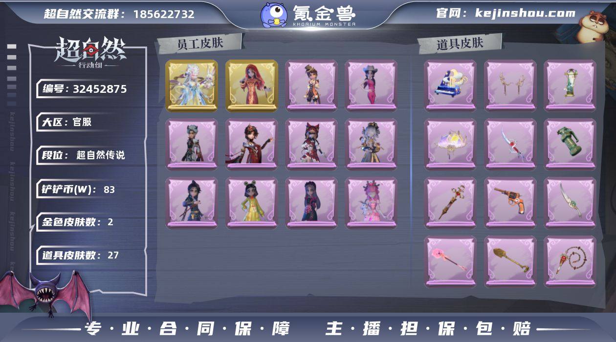 金皮2;紫皮10;道具皮17;皮肤:逍遥-莲华渡,莉莉-瑶台梦,阿念-庆宴绮愿,兰-千夜星谕,爱丽丝-丝缕哀歌,小黄-呱呱雨衣,小黄-霓裳踏雪,逍遥-绣春逍影,爱丽丝-耀眼的你,莉莉-除妖小师妹,薇薇安-仙锋小姐,莉莉-莓果陷阱;道具:桃木剑-最后的独角兽,铲子-龙鳞,折扇-赴此良宵,黄牛能量饮料-珍珠芭乐莓莓,刺刀-碧络琅环,黄牛能量饮料-雪顶奇愿,铲子-圣心之泪,黄牛能量饮料-青玉抱丹,腰包-惊魂娃娃,铲子-撒拉弗的祷告,长枪-罪棘,急救包-蔷薇物语,闪光弹-金戈玄铜,传送按钮-浮生一梦,转轮手枪-新星时代,夜视仪-敛花容,音响-鸣沙鼓;饰品:头饰-蒜了八,头饰-雪墩墩头套,头饰-芝麻糊汤圆,头饰-哈士奇头套,头饰-咬咬鲨头套,头饰-大葱明头套,头饰-嘻嘻头套,头饰-炙热烧烤,头饰-呆滞头套,头饰-马上有钱,头饰-鳄霸天头套,头饰-驼半仙头套,头饰-烈焰红唇头套,头饰-萨卡班甲鱼头套,头饰-面具马头套,头饰-火爆了头套,头饰-樱桃奶油布丁,头饰-鱼头怪头套,头饰-惊魂南瓜头套,头饰-太空鲨头套,头饰-卑微头套,头饰-烛光纪念,头饰-滑稽头套,头饰-哞哞牛头套,头饰-像素朋克墨镜,头饰-粽小宝头套,头饰-后室幸存者头套,挂饰-晚安小熊,挂饰-拂云仙,挂饰-小小玛丽,挂饰-天使消失的年代,挂饰-孤独对望,挂饰-桂冠聆诗,背饰-牛啤背包,背饰-天使的呼唤,背饰-醉花阴;动作:动作-抖肩舞,动作-luvaboy,动作-姬芽摇,动作-新年摇,动作-金城舞,动作-舞台中心,动作-星奇摇,动作-要糖,动作-KT猫摇,动作-带你逃跑吧,动作-拜年,动作-抬手,动作-举牌;工牌背景:工牌背景-永恒之阶,工牌背景-童话扉页,工牌背景-复活的肖像,工牌背景-甜酷指令,工牌背景-粉嫩小海狸,工牌背景-舞台终演,工牌背景-流金照庭;工牌动作:工牌动作-虔诚之姿,工牌动作-净禅,工牌动作-轻躯鹤立,工牌动作-春色盈怀;员工:薇薇安,员工-莉莉,员工-巫铃儿,员工-爱德华,员工-逍遥,员工-临...