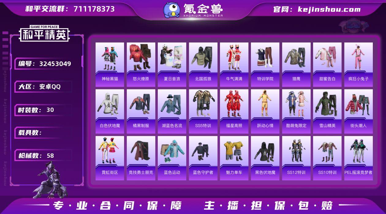 HX9280【游戏等级52-神秘黑猫-1王牌印记-素材号】安卓 手Q-0粉装-0特效枪-0载具-0粉色飞行器-15116热力值-1王牌印记-48套装-58枪皮 【粉色降落伞】:深海曼妙降落伞,四圣焕新降落伞 【稀有枪皮】:AKM-夜灯,AKM-破晓战魂,AKM-霓虹街区,M16A4-魔法学院,M416-夜灯,M416-红色方程式,M416-蓝色火焰,GROZA-黑色刀锋,AUG-耀粉歌者,M762-拳皇97,M762-牛气冲天,G36C-不夜海上花,UZI-众神之王,UMP45-蓝色火焰,Vector-彩虹符号,Vector-黑色刀锋,汤姆逊-勇闯险境,MP5K-众神之王,Kar98K-勇闯险境,Kar98K-彩虹符号,M24-众神之王,SKS-勇闯险境,SKS-夜灯,VSS-黑色刀锋,Mini14-炫彩节奏,SLR-众神之王,QBU-不夜海上花,S686-不夜海上花,S686-红色方程式,S1897-勇闯险境,M249-拳皇97,P92-拳皇97 【其他套装】:套装-SS5特训,套装-SS6特训,套装-SS7特训,套装-SS8特训,套装-SS9特训,套装-SS10特训,套装-SS12特训,套装-SS14特训,套装-丛林猎人,套装-传奇侦探,套装-北国孤狼,套装-夏日音浪,套装-怒火燎原,套装-拳皇97草薙京,套装-格斗专家,套装-橘黑制服,套装-湖蓝色名流,安卓Q区-15116热力值-1王牌印记-48套装-58枪皮【稀有武器皮肤】: SCAR-L-海...