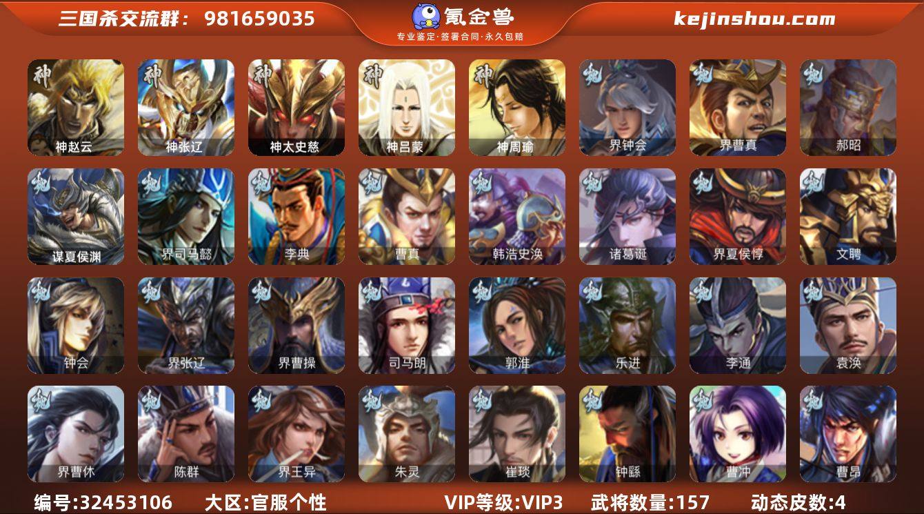 官阶:先锋将军;VIP等级:VIP3;史诗武将数量:7;动态皮肤数量:4;武将总数:157;史诗宝珠数量:0;将魂数量:41;神将:3;魏国史诗武将:4;蜀国史诗武将:1;吴国史诗武将:0;群史诗武将:0