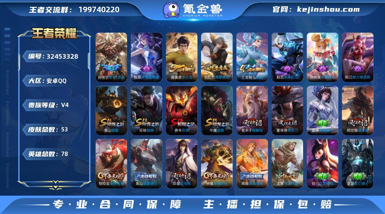 AL691505 皮肤数53 传说皮肤数1 史诗皮肤数7 英雄数78 营地id230039694 贵族等级【文本】贵族4级 【贵族4级】 限定皮肤19 赛季限定13 史诗皮肤7 勇者皮肤30 其他皮肤15 限定皮肤:达摩沙漠行僧,钟馗驱傩正仪,程咬金演武夺筹,狄仁杰万华元夜,项羽海滩派对,孙悟空零号赤焰,裴擒虎李小龙,鬼谷子原初探秘者,狄仁杰鹰眼统帅,老夫子醍醐杖,明世隐疑决卦,狄仁杰阴阳师,弈星混沌棋,夏侯惇朔风刀,上官婉儿梁祝,盾山御銮,牛魔御旌,狂铁御狮,典韦穷奇; 赛季限定:达摩沙漠行僧,钟馗驱傩正仪,程咬金演武夺筹,狄仁杰万华元夜,鬼谷子原初探秘者,老夫子醍醐杖,明世隐疑决卦,弈星混沌棋,夏侯惇朔风刀,盾山御銮,牛魔御旌,狂铁御狮,典韦穷奇; 史诗皮肤:孙尚香水果甜心,赵云未来纪元,甄姬冰雪圆舞曲,裴擒虎李小龙,狄仁杰鹰眼统帅,上官婉儿梁祝,妲己魅力维加斯; 勇者皮肤:刘禅秘密基地,周瑜熔金海岸,达摩沙漠行僧,盾山圆桌骑士,花木兰兔女郎,钟馗驱傩正仪,程咬金演武夺筹,露娜瓷语鉴心,杨戬次元傲视,狄仁杰万华元夜,项羽海滩派对,钟无艳海滩丽影,露娜哥特玫瑰,鬼谷子原初探秘者,典韦黄金武士,老夫子醍醐杖,宫本武藏万象初新,明世隐疑决...