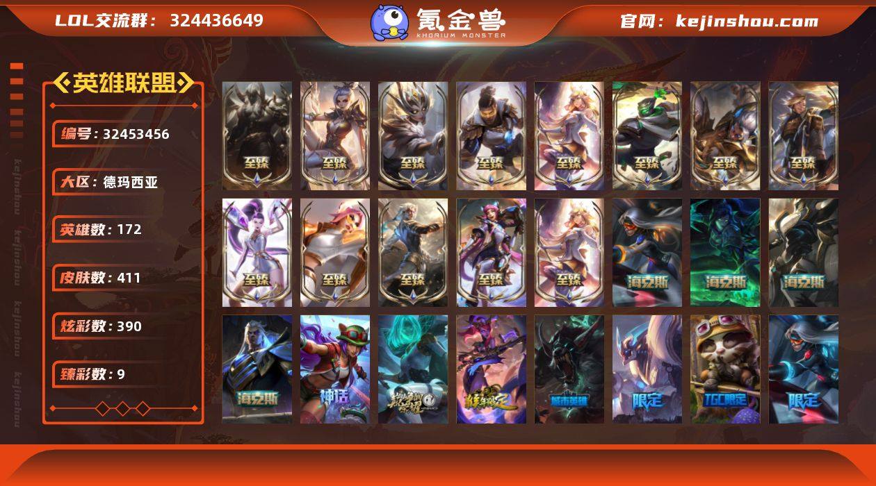 【特价出售/店主推荐】 未定级段位-153英雄-350皮肤-22炫彩-1终极-7神话-55限定-28传说-93史诗 【神话皮肤】:十周年纪念安妮,源代码乐芙兰,神凰行者瑞羽圣凰艾尼维亚,海克斯科技斯维因,零之枪骑赫卡里姆,至臻星之守护者妮蔻,至臻战斗学院拉克丝 【至臻皮肤】:至臻战斗学院拉克丝,至臻星之守护者妮蔻 【臻彩皮肤】:征服者韦鲁斯炫金,战斗学院卡特琳娜盛典礼服 【年限皮肤】:神龙之翼库奇,广寒仙子嫦娥,美猴王孙悟空,司马懿仲达 【海克斯皮肤】:海克斯科技斯维因,零之枪骑赫卡里姆 【情人节限定】:觅心女王艾希,觅心魔灵奥莉安娜 【冰雪限定】:幸福女神乐芙兰,圣诞开心鬼提莫,圣诞精灵崔丝塔娜,圣诞狂欢努努和威朗普,圣诞狂欢基兰,阿木木“主人不要我了”,胡桃夹子萨科,平安夜女神娑娜,邪恶圣诞老人维迦,雪默丁格,圣诞玩偶波比,圣诞老人古拉加斯,圣诞驯鹿克格莫,雪球也能爆炸吉格斯,冰雪节辛吉德 【终极皮肤】:灵魂守卫乌迪尔 【限定皮肤】:舞会公主安妮,冠军之矛卡莉丝塔,冠军之隐劫,Fnatic迦娜,暗杀星蒙多,暗杀星努努和威朗普,SKTT1贾克斯,SKTT1李青,SKTT1薇恩,SSW辛吉德,SSW图奇,SSG霞,安妮梦游仙境,胜利女神奥莉安娜,南瓜...